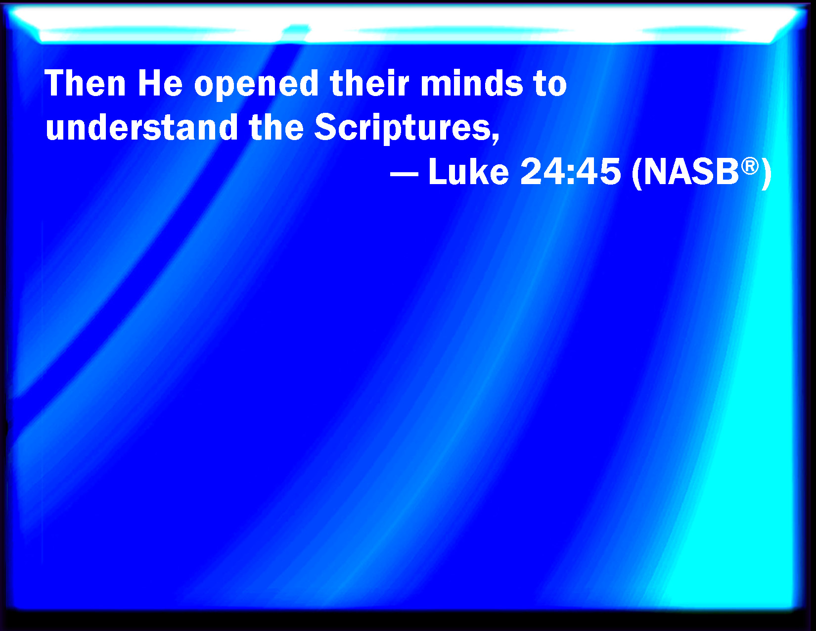 Bible Verse Slide Luke 24:45 Then opened he their understanding, that they might understand the scriptures, KJV: Then opened he their understanding, that they might understand the scriptures, DRB: Then he opened their understanding, that they might understand the scriptures. DBT: Then he opened their understanding to understand the scriptures, ERV: Then opened he their mind, that they might understand the scriptures; WBT: Then he opened their understanding, that they might understand the scriptures, WEB: Then he opened their minds, that they might understand the Scriptures. YLT: Then opened he up their understanding to understand the Writings,Links Luke 24:45 NIV • Luke 24:45 NLT • Luke 24:45 ESV • Luke 24:45 NASB • Luke 24:45 KJV • Luke 24:45 Interlinear • Luke 24:45 Commentaries • Luke 24:45 Parallel Texts • Luke 24:45 Bible Apps • Luke 24:45 Parallel • Bible Hub |