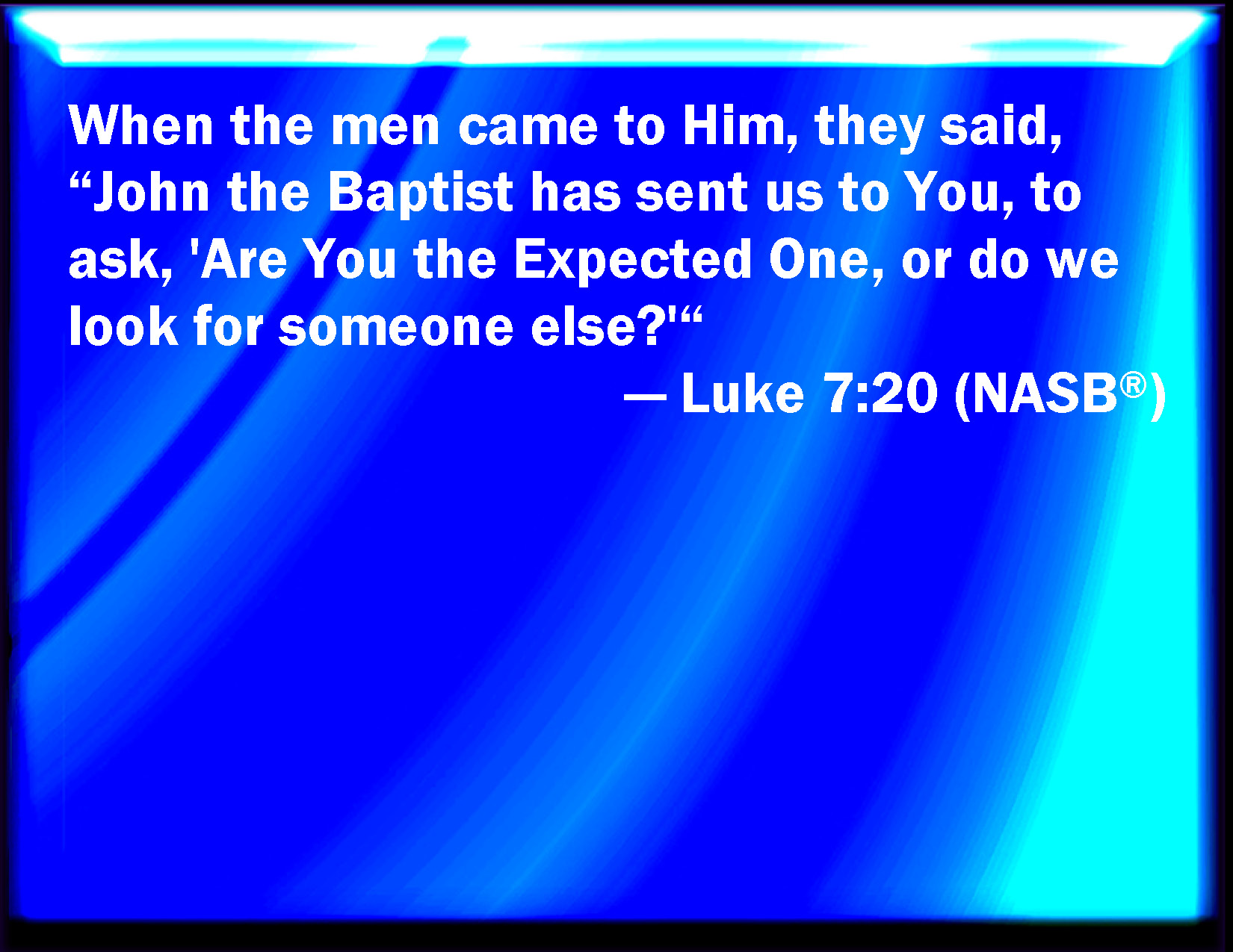 Bible Verse Slide Luke 7:20 When the men were come to him, they said, John Baptist has sent us to you, saying, Are you he that should come? or look we for another? KJV: When the men were come unto him, they said, John Baptist hath sent us unto thee, saying, Art thou he that should come? or look we for another? DRB: And when the men were come unto him, they said: John the Baptist hath sent us to thee, saying: Art thou he that art to come; or look we for another? DBT: But the men having come to him said, John the baptist has sent us to thee, saying, Art thou he that is coming, or are we to wait for another? ERV: And when the men were come unto him, they said, John the Baptist hath sent us unto thee, saying, Art thou he that cometh, or look we for another? WBT: When the men had come to him, they said, John the Baptist hath sent us to thee, saying, Art thou he that should come? or look we for another? WEB: When the men had come to him, they said, "John the Baptizer has sent us to you, saying, 'Are you he who comes, or should we look for another?'" YLT: And having come near to him, the men said, 'John the Baptist sent us unto thee, saying, Art thou he who is coming, or for another do we look?'Links Luke 7:20 NIV • Luke 7:20 NLT • Luke 7:20 ESV • Luke 7:20 NASB • Luke 7:20 KJV • Luke 7:20 Interlinear • Luke 7:20 Commentaries • Luke 7:20 Parallel Texts • Luke 7:20 Bible Apps • Luke 7:20 Parallel • Bible Hub |