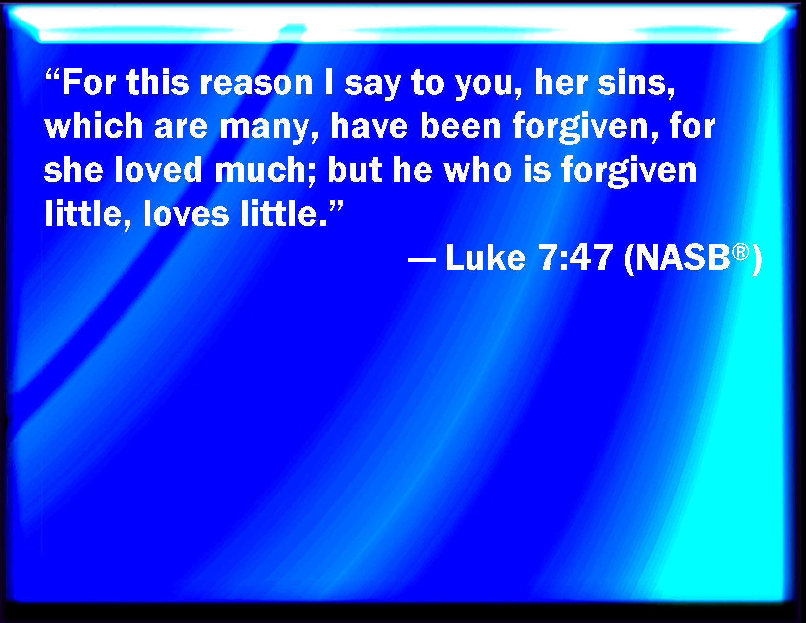 Bible Verse Slide Luke 7:47 Why I say to you, Her sins, which are many, are forgiven; for she loved much: but to whom little is forgiven, the same loves little. KJV: Wherefore I say unto thee, Her sins, which are many, are forgiven; for she loved much: but to whom little is forgiven, the same loveth little. DRB: Wherefore I say to thee: Many sins are forgiven her, because she hath loved much. But to whom less is forgiven, he loveth less. DBT: For which cause I say to thee, Her many sins are forgiven; for she loved much; but he to whom little is forgiven loves little. ERV: Wherefore I say unto thee, Her sins, which are many, are forgiven; for she loved much: but to whom little is forgiven, the same loveth little. WBT: Wherefore I say to thee, Her sins, which are many, are forgiven; for she loved much: but to whom little is forgiven, the same loveth little. WEB: Therefore I tell you, her sins, which are many, are forgiven, for she loved much. But to whom little is forgiven, the same loves little." YLT: therefore I say to thee, her many sins have been forgiven, because she did love much; but to whom little is forgiven, little he doth love.'Links Luke 7:47 NIV • Luke 7:47 NLT • Luke 7:47 ESV • Luke 7:47 NASB • Luke 7:47 KJV • Luke 7:47 Interlinear • Luke 7:47 Commentaries • Luke 7:47 Parallel Texts • Luke 7:47 Bible Apps • Luke 7:47 Parallel • Bible Hub |