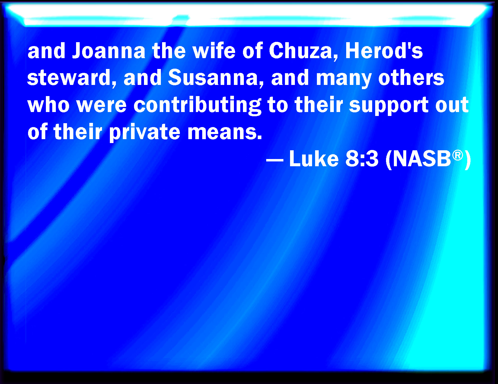 Bible Verse Slide Luke 8:3 And Joanna the wife of Chuza Herod's steward, and Susanna, and many others, which ministered to him of their substance. KJV: And Joanna the wife of Chuza Herod's steward, and Susanna, and many others, which ministered unto him of their substance. DRB: And Joanna the wife of Chusa, Herod's steward, and Susanna, and many others who ministered unto him of their substance. DBT: and Joanna, wife of Chuza, Herod's steward, and Susanna, and many others, who ministered to him of their substance. ERV: and Joanna the wife of Chuza Herod's steward, and Susanna, and many others, which ministered unto them of their substance. WBT: And Joanna the wife of Chuza Herod's steward, and Susanna, and many others, who ministered to him of their substance. WEB: and Joanna, the wife of Chuzas, Herod's steward; Susanna; and many others; who served them from their possessions. YLT: and Joanna wife of Chuza, steward of Herod, and Susanna, and many others, who were ministering to him from their substance.Links Luke 8:3 NIV • Luke 8:3 NLT • Luke 8:3 ESV • Luke 8:3 NASB • Luke 8:3 KJV • Luke 8:3 Interlinear • Luke 8:3 Commentaries • Luke 8:3 Parallel Texts • Luke 8:3 Bible Apps • Luke 8:3 Parallel • Bible Hub |