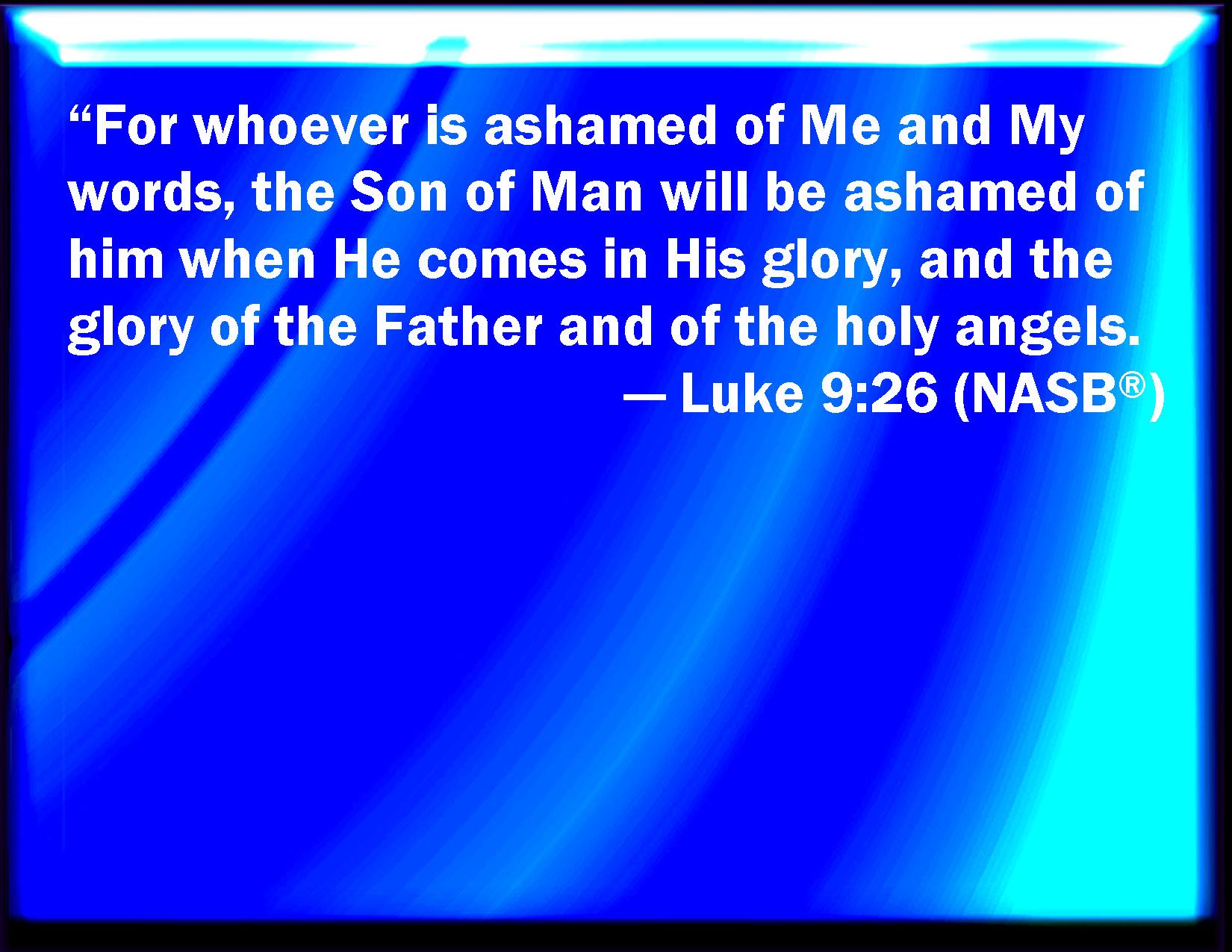 Bible Verse Slide Luke 9:26 For whoever shall be ashamed of me and of my words, of him shall the Son of man be ashamed, when he shall come in his own glory, and in his Father's, and of the holy angels. KJV: For whosoever shall be ashamed of me and of my words, of him shall the Son of man be ashamed, when he shall come in his own glory, and in his Father's, and of the holy angels. DRB: For he that shall be ashamed of me and of my words, of him the Son of man shall be ashamed, when he shall come in his majesty, and that of his Father, and of the holy angels. DBT: For whosoever shall have been ashamed of me and of my words, of him will the Son of man be ashamed when he shall come in his glory, and in that of the Father, and of the holy angels. ERV: For whosoever shall be ashamed of me and of my words, of him shall the Son of man be ashamed, when he cometh in his own glory, and the glory of the Father, and of the holy angels. WBT: For whoever shall be ashamed of me, and of my words, of him will the Son of man be ashamed, when he shall come in his own glory, and in that of his Father, and of the holy angels. WEB: For whoever will be ashamed of me and of my words, of him will the Son of Man be ashamed, when he comes in his glory, and the glory of the Father, and of the holy angels. YLT: 'For whoever may be ashamed of me, and of my words, of this one shall the Son of Man be ashamed, when he may come in his glory, and the Father's, and the holy messengers';Links Luke 9:26 NIV • Luke 9:26 NLT • Luke 9:26 ESV • Luke 9:26 NASB • Luke 9:26 KJV • Luke 9:26 Interlinear • Luke 9:26 Commentaries • Luke 9:26 Parallel Texts • Luke 9:26 Bible Apps • Luke 9:26 Parallel • Bible Hub |