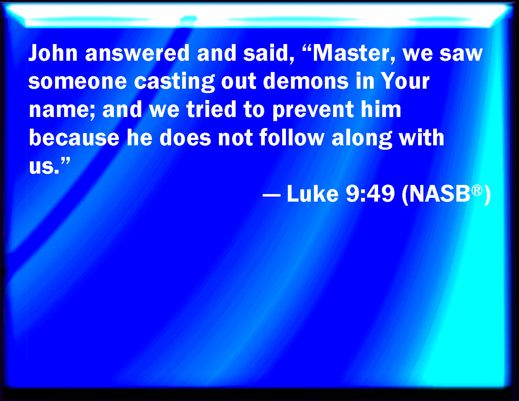 Bible Verse Slide Luke 9:49 And John answered and said, Master, we saw one casting out devils in your name; and we forbade him, because he follows not with us. KJV: And John answered and said, Master, we saw one casting out devils in thy name; and we forbad him, because he followeth not with us. DRB: And John, answering, said: Master, we saw a certain man casting out devils in thy name, and we forbade him, because he followeth not with us. DBT: And John answering said, Master, we saw some one casting out demons in thy name, and we forbad him, because he follows not with us. ERV: And John answered and said, Master, we saw one casting out devils in thy name; and we forbade him, because he followeth not with us. WBT: And John answered and said, Master, we saw one casting out demons in thy name; and we forbad him, because he followeth not with us. WEB: John answered, "Master, we saw someone casting out demons in your name, and we forbade him, because he doesn't follow with us." YLT: And John answering said, 'Master, we saw a certain one in thy name casting forth the demons, and we forbade him, because he doth not follow with us;'Links Luke 9:49 NIV • Luke 9:49 NLT • Luke 9:49 ESV • Luke 9:49 NASB • Luke 9:49 KJV • Luke 9:49 Interlinear • Luke 9:49 Commentaries • Luke 9:49 Parallel Texts • Luke 9:49 Bible Apps • Luke 9:49 Parallel • Bible Hub |