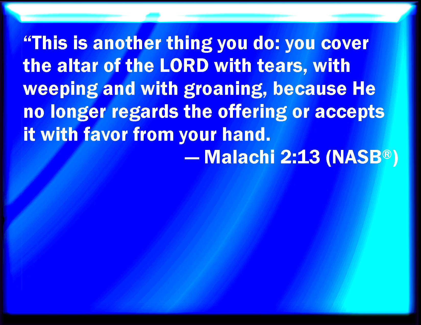 Bible Verse Slide Malachi 2:13 And this have you done again, covering the altar of the LORD with tears, with weeping, and with crying out, so that he regards not the offering any more, or receives it with good will at your hand. KJV: And this have ye done again, covering the altar of the LORD with tears, with weeping, and with crying out, insomuch that he regardeth not the offering any more, or receiveth it with good will at your hand. DRB: And this again have you done, you have covered the altar of the Lord with tears, with weeping, and bellowing, so that I have no more a regard to sacrifice, neither do I accept any atonement at your hands. DBT: And further ye do this: ye cover the altar of Jehovah with tears, with weeping, and with sighing, insomuch that he regardeth not the oblation any more, nor receiveth it with satisfaction at your hand. ERV: And this again ye do: ye cover the altar of the LORD with tears, with weeping, and with sighing, insomuch that he regardeth not the offering any more, neither receiveth it with good will at your hand. WBT: And this have ye done again, covering the altar of the LORD with tears, with weeping, and with crying out, insomuch that he regardeth not the offering any more, or receiveth it with good will at your hand. WEB: This again you do: you cover the altar of Yahweh with tears, with weeping, and with sighing, because he doesn't regard the offering any more, neither receives it with good will at your hand. YLT: And this a second time ye do, Covering with tears the altar of Jehovah, With weeping and groaning, Because there is no more turning unto the present, Or receiving of a pleasing thing from your hand.Links Malachi 2:13 NIV • Malachi 2:13 NLT • Malachi 2:13 ESV • Malachi 2:13 NASB • Malachi 2:13 KJV • Malachi 2:13 Interlinear • Malachi 2:13 Commentaries • Malachi 2:13 Parallel Texts • Malachi 2:13 Bible Apps • Malachi 2:13 Parallel • Bible Hub |