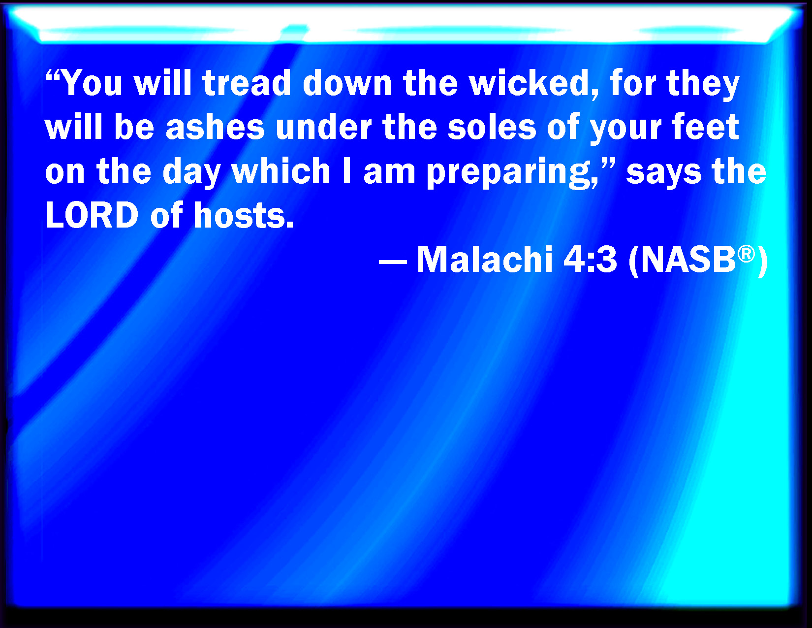Bible Verse Slide Malachi 4:3 And you shall tread down the wicked; for they shall be ashes under the soles of your feet in the day that I shall do this, said the LORD of hosts. KJV: And ye shall tread down the wicked; for they shall be ashes under the soles of your feet in the day that I shall do this, saith the LORD of hosts. DRB: And you shall tread down the wicked when they shall be ashes under the sole of your feet in the day that I do this, saith the Lord of hosts. DBT: And ye shall tread down the wicked; for they shall be ashes under the soles of your feet in the day that I prepare, saith Jehovah of hosts. ERV: And ye shall tread down the wicked; for they shall be ashes under the soles of your feet in the day that I do make, saith the LORD of hosts. WBT: And ye shall tread down the wicked; for they shall be ashes under the soles of your feet in the day that I shall do this, saith the LORD of hosts. WEB: You shall tread down the wicked; for they will be ashes under the soles of your feet in the day that I make," says Yahweh of Armies. YLT: And ye have trodden down the wicked, For they are ashes under the soles of your feet, In the day that I am appointing, Said Jehovah of Hosts.Links Malachi 4:3 NIV • Malachi 4:3 NLT • Malachi 4:3 ESV • Malachi 4:3 NASB • Malachi 4:3 KJV • Malachi 4:3 Interlinear • Malachi 4:3 Commentaries • Malachi 4:3 Parallel Texts • Malachi 4:3 Bible Apps • Malachi 4:3 Parallel • Bible Hub |