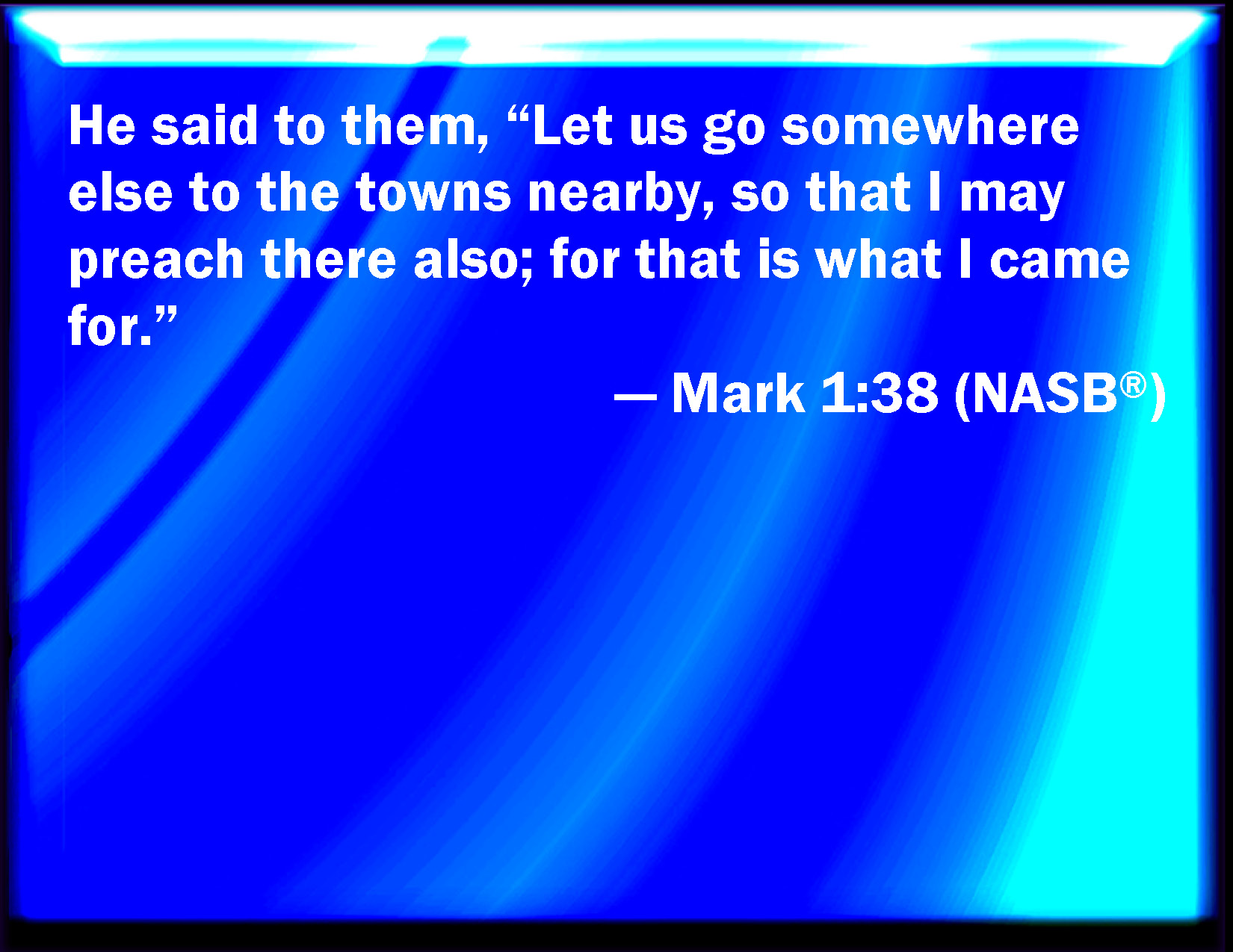 Bible Verse Slide Mark 1:38 And he said to them, Let us go into the next towns, that I may preach there also: for therefore came I forth. KJV: And he said unto them, Let us go into the next towns, that I may preach there also: for therefore came I forth. DRB: And he saith to them: Let us go into the neighbouring towns and cities, that I may preach there also; for to this purpose am I come. DBT: And he says to them, Let us go elsewhere into the neighbouring country towns, that I may preach there also, for for this purpose am I come forth. ERV: And he saith unto them, Let us go elsewhere into the next towns, that I may preach there also; for to this end came I forth. WBT: And he said to them, Let us go into the next towns, that I may preach there also: for, for this purpose have I come. WEB: He said to them, "Let's go elsewhere into the next towns, that I may preach there also, because I came out for this reason." YLT: and he saith to them, 'We may go to the next towns, that there also I may preach, for for this I came forth.'Links Mark 1:38 NIV • Mark 1:38 NLT • Mark 1:38 ESV • Mark 1:38 NASB • Mark 1:38 KJV • Mark 1:38 Interlinear • Mark 1:38 Commentaries • Mark 1:38 Parallel Texts • Mark 1:38 Bible Apps • Mark 1:38 Parallel • Bible Hub |