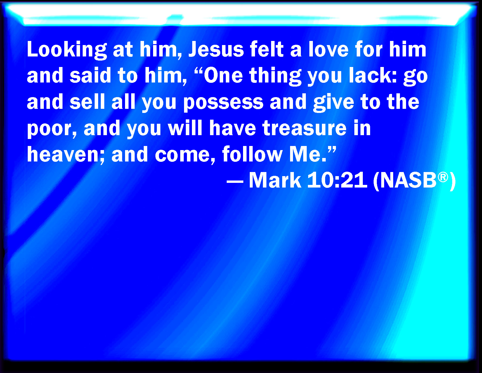 Bible Verse Slide Mark 10:21 Then Jesus beholding him loved him, and said to him, One thing you lack: go your way, sell whatever you have, and give to the poor, and you shall have treasure in heaven: and come, take up the cross, and follow me. KJV: Then Jesus beholding him loved him, and said unto him, One thing thou lackest: go thy way, sell whatsoever thou hast, and give to the poor, and thou shalt have treasure in heaven: and come, take up the cross, and follow me. DRB: And Jesus looking on him, loved him, and said to him: One thing is wanting unto thee: go, sell whatsoever thou hast, and give to the poor, and thou shalt have treasure in heaven; and come, follow me. DBT: And Jesus looking upon him loved him, and said to him, One thing lackest thou: go, sell whatever thou hast and give to the poor, and thou shalt have treasure in heaven; and come, follow me, taking up the cross. ERV: And Jesus looking upon him loved him, and said unto him, One thing thou lackest: go, sell whatsoever thou hast, and give to the poor, and thou shalt have treasure in heaven: and come, follow me. WBT: Then Jesus beholding him loved him, and said to him, One thing thou lackest: go, sell whatever thou hast, and give to the poor, and thou shalt have treasure in heaven; and come, take up the cross, and follow me. WEB: Jesus looking at him loved him, and said to him, "One thing you lack. Go, sell whatever you have, and give to the poor, and you will have treasure in heaven; and come, follow me, taking up the cross." YLT: And Jesus having looked upon him, did love him, and said to him, 'One thing thou dost lack; go away, whatever thou hast — sell, and give to the poor, and thou shalt have treasure in heaven, and come, be following me, having taken up the cross.'Links Mark 10:21 NIV • Mark 10:21 NLT • Mark 10:21 ESV • Mark 10:21 NASB • Mark 10:21 KJV • Mark 10:21 Interlinear • Mark 10:21 Commentaries • Mark 10:21 Parallel Texts • Mark 10:21 Bible Apps • Mark 10:21 Parallel • Bible Hub |