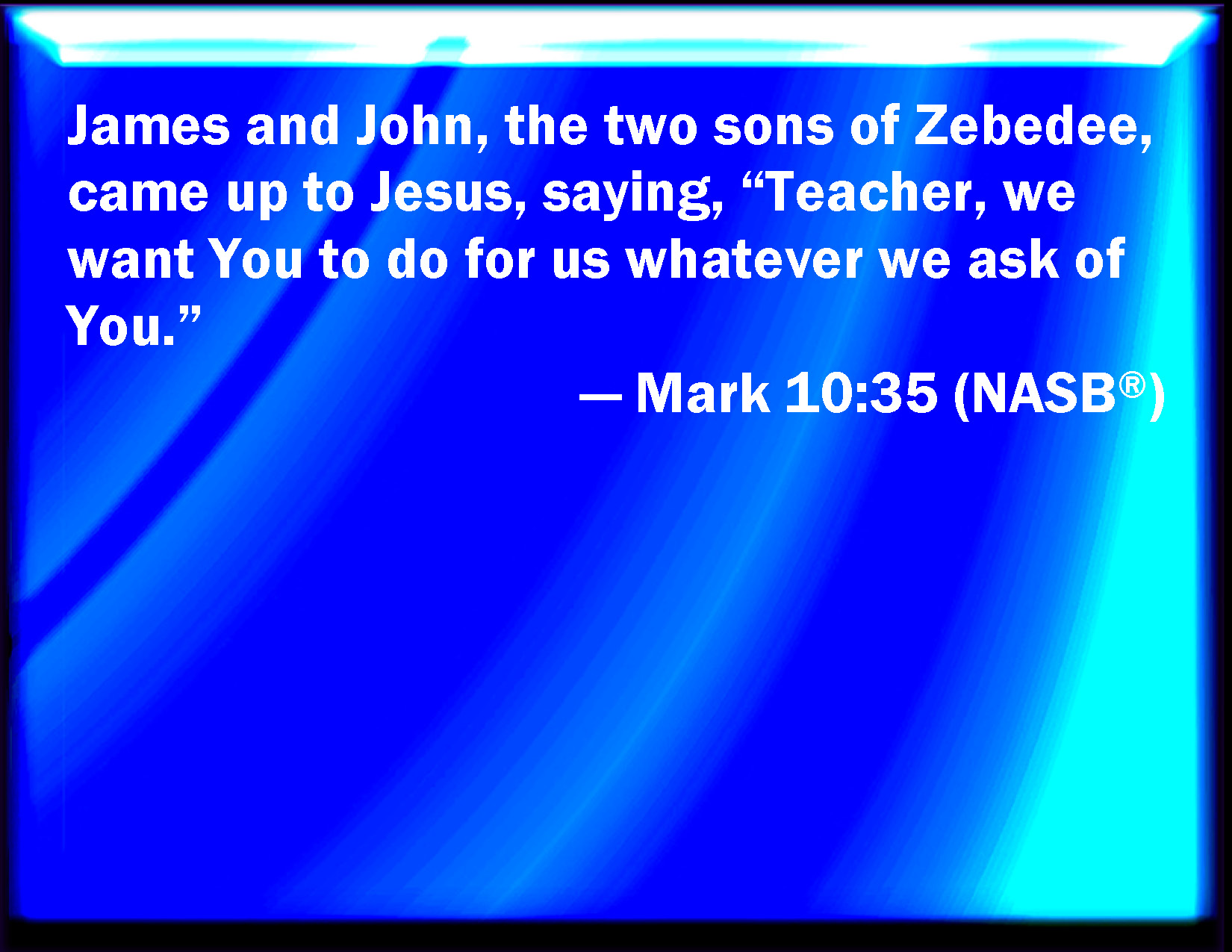 Bible Verse Slide Mark 10:35 And James and John, the sons of Zebedee, come to him, saying, Master, we would that you should do for us whatever we shall desire. KJV: And James and John, the sons of Zebedee, come unto him, saying, Master, we would that thou shouldest do for us whatsoever we shall desire. DRB: And James and John the sons of Zebedee, come to him, saying: Master, we desire that whatsoever we shall ask, thou wouldst do it for us: DBT: And there come to him James and John, the sons of Zebedee, saying to him, Teacher, we would that whatsoever we may ask thee, thou wouldst do it for us. ERV: And there come near unto him James and John, the sons of Zebedee, saying unto him, Master, we would that thou shouldest do for us whatsoever we shall ask of thee. WBT: And James and John the sons of Zebedee come to him, saying, Master, we would that thou shouldest do for us whatever we shall desire. WEB: James and John, the sons of Zebedee, came near to him, saying, "Teacher, we want you to do for us whatever we will ask." YLT: And there come near to him James and John, the sons of Zebedee, saying, 'Teacher, we wish that whatever we may ask for ourselves, thou mayest do for us;'Links Mark 10:35 NIV • Mark 10:35 NLT • Mark 10:35 ESV • Mark 10:35 NASB • Mark 10:35 KJV • Mark 10:35 Interlinear • Mark 10:35 Commentaries • Mark 10:35 Parallel Texts • Mark 10:35 Bible Apps • Mark 10:35 Parallel • Bible Hub |