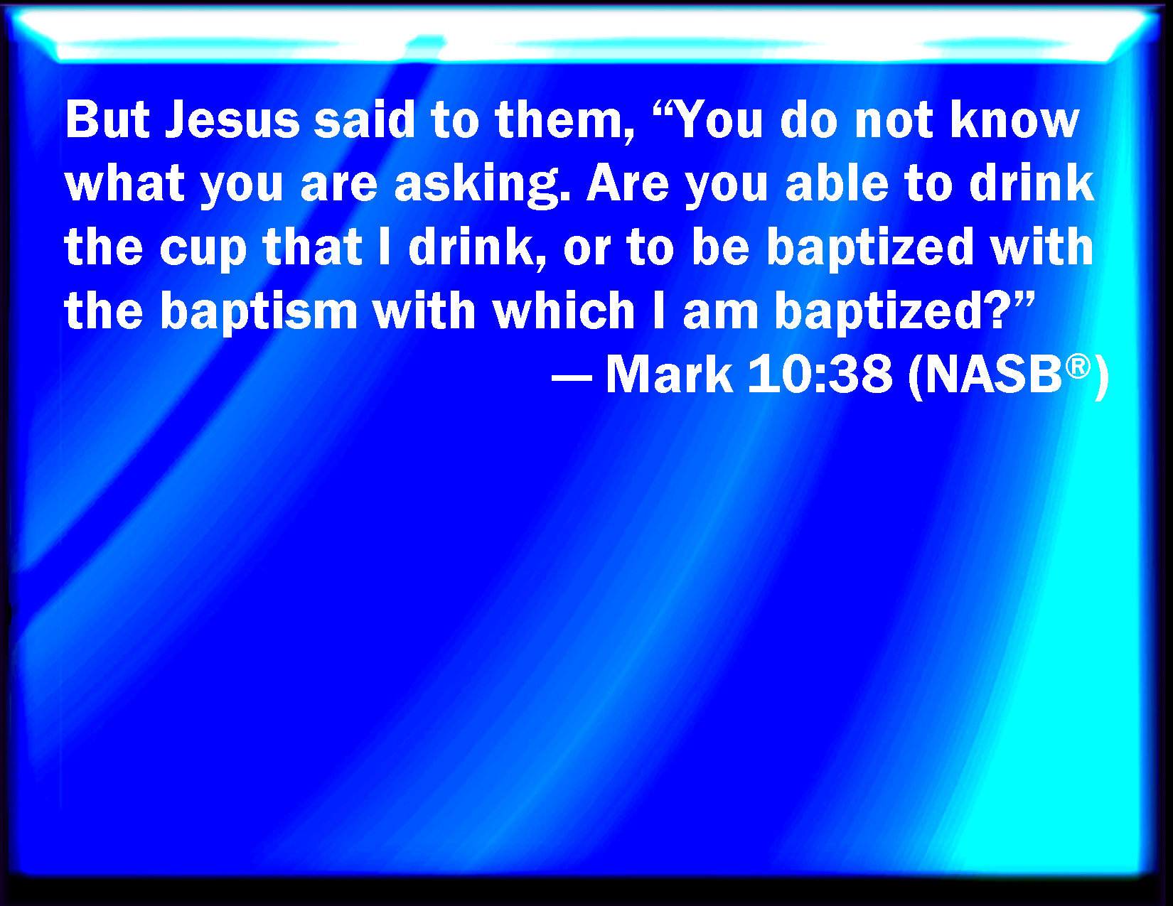Bible Verse Slide Mark 10:38 But Jesus said to them, You know not what you ask: can you drink of the cup that I drink of? and be baptized with the baptism that I am baptized with? KJV: But Jesus said unto them, Ye know not what ye ask: can ye drink of the cup that I drink of? and be baptized with the baptism that I am baptized with? DRB: And Jesus said to them: You know not what you ask. Can you drink of the chalice that I drink of: or be baptized with the baptism wherewith I am baptized? DBT: And Jesus said to them, Ye do not know what ye ask. Are ye able to drink the cup which I drink, or be baptised with the baptism that I am baptised with? ERV: But Jesus said unto them, Ye know not what ye ask. Are ye able to drink the cup that I drink? or to be baptized with the baptism that I am baptized with? WBT: But Jesus said to them, Ye know not what ye ask: can ye drink of the cup that I drink of? and be baptized with the baptism that I am baptized with? WEB: But Jesus said to them, "You don't know what you are asking. Are you able to drink the cup that I drink, and to be baptized with the baptism that I am baptized with?" YLT: and Jesus said to them, 'Ye have not known what ye ask; are ye able to drink of the cup that I drink of, and with the baptism that I am baptized with — to be baptized?'Links Mark 10:38 NIV • Mark 10:38 NLT • Mark 10:38 ESV • Mark 10:38 NASB • Mark 10:38 KJV • Mark 10:38 Interlinear • Mark 10:38 Commentaries • Mark 10:38 Parallel Texts • Mark 10:38 Bible Apps • Mark 10:38 Parallel • Bible Hub |