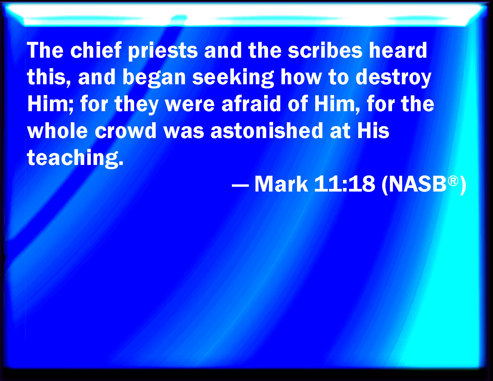Bible Verse Slide Mark 11:18 And the scribes and chief priests heard it, and sought how they might destroy him: for they feared him, because all the people was astonished at his doctrine. KJV: And the scribes and chief priests heard it, and sought how they might destroy him: for they feared him, because all the people was astonished at his doctrine. DRB: Which when the chief priests and the scribes had heard, they sought how they might destroy him. For they feared him, because the whole multitude was in admiration at his doctrine. DBT: And the chief priests and the scribes heard it, and they sought how they might destroy him; for they feared him, because all the crowd were astonished at his doctrine. ERV: And the chief priests and the scribes heard it, and sought how they might destroy him: for they feared him, for all the multitude was astonished at his teaching. WBT: And the scribes and chief priests heard it, and sought how they might destroy him: for they feared him, because all the people were astonished at his doctrine. WEB: The chief priests and the scribes heard it, and sought how they might destroy him. For they feared him, because all the multitude was astonished at his teaching. YLT: And the scribes and the chief priests heard, and they were seeking how they shall destroy him, for they were afraid of him, because all the multitude was astonished at his teaching;Links Mark 11:18 NIV • Mark 11:18 NLT • Mark 11:18 ESV • Mark 11:18 NASB • Mark 11:18 KJV • Mark 11:18 Interlinear • Mark 11:18 Commentaries • Mark 11:18 Parallel Texts • Mark 11:18 Bible Apps • Mark 11:18 Parallel • Bible Hub |