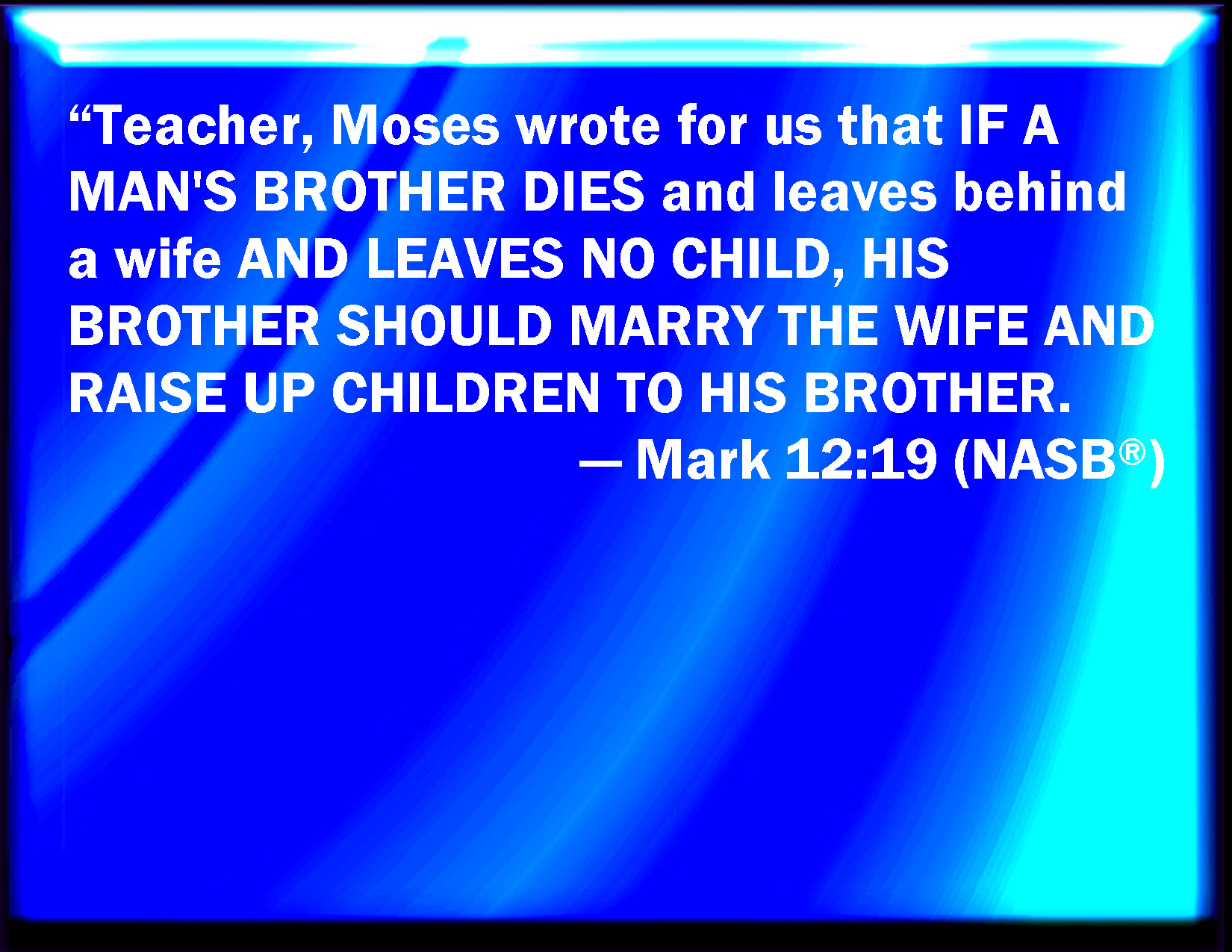 Bible Verse Slide Mark 12:19 Master, Moses wrote to us, If a man's brother die, and leave his wife behind him, and leave no children, that his brother should take his wife, and raise up seed to his brother. KJV: Master, Moses wrote unto us, If a man's brother die, and leave his wife behind him, and leave no children, that his brother should take his wife, and raise up seed unto his brother. DRB: Master, Moses wrote unto us, that if any man's brother die, and leave his wife behind him, and leave no children, his brother should take his wife, and raise up seed to his brother. DBT: Teacher, Moses wrote to us that if any one's brother die, and leave a wife behind, and leave no children, that his brother shall take his wife, and raise up seed to his brother. ERV: Master, Moses wrote unto us, If a man's brother die, and leave a wife behind him, and leave no child, that his brother should take his wife, and raise up seed unto his brother. WBT: Master, Moses wrote to us, If a man's brother shall die, and leave his wife, and leave no children, that his brother should take his wife, and raise seed to his brother. WEB: "Teacher, Moses wrote to us, 'If a man's brother dies, and leaves a wife behind him, and leaves no children, that his brother should take his wife, and raise up offspring for his brother.' YLT: 'Teacher, Moses wrote to us, that if any one's brother may die, and may leave a wife, and may leave no children, that his brother may take his wife, and raise up seed to his brother.Links Mark 12:19 NIV • Mark 12:19 NLT • Mark 12:19 ESV • Mark 12:19 NASB • Mark 12:19 KJV • Mark 12:19 Interlinear • Mark 12:19 Commentaries • Mark 12:19 Parallel Texts • Mark 12:19 Bible Apps • Mark 12:19 Parallel • Bible Hub |