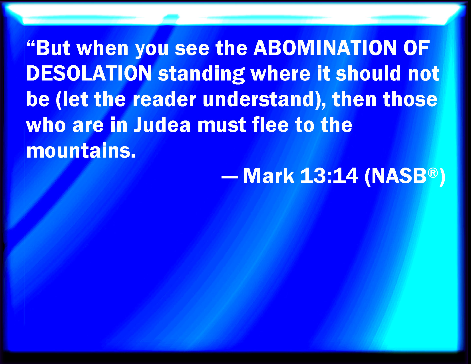 Bible Verse Slide Mark 13:14 But when you shall see the abomination of desolation, spoken of by Daniel the prophet, standing where it ought not, (let him that reads understand,) then let them that be in Judaea flee to the mountains: KJV: But when ye shall see the abomination of desolation, spoken of by Daniel the prophet, standing where it ought not, (let him that readeth understand,) then let them that be in Judaea flee to the mountains: DRB: And when you shall see the abomination of desolation, standing where it ought not: he that readeth let him understand: then let them that are in Judea, flee unto the mountains: DBT: But when ye shall see the abomination of desolation standing where it should not, (he that reads let him consider it,) then let those in Judaea flee to the mountains; ERV: But when ye see the abomination of desolation standing where he ought not (let him that readeth understand), then let them that are in Judaea flee unto the mountains: WBT: But when ye shall see the abomination of desolation, spoken of by Daniel the prophet, standing where it ought not, (let him that readeth understand) then let them that are in Judea flee to the mountains: WEB: But when you see the abomination of desolation, spoken of by Daniel the prophet, standing where it ought not (let the reader understand), then let those who are in Judea flee to the mountains, YLT: 'And when ye may see the abomination of the desolation, that was spoken of by Daniel the prophet, standing where it ought not, (whoever is reading let him understand), then those in Judea, let them flee to the mountains;Links Mark 13:14 NIV • Mark 13:14 NLT • Mark 13:14 ESV • Mark 13:14 NASB • Mark 13:14 KJV • Mark 13:14 Interlinear • Mark 13:14 Commentaries • Mark 13:14 Parallel Texts • Mark 13:14 Bible Apps • Mark 13:14 Parallel • Bible Hub |