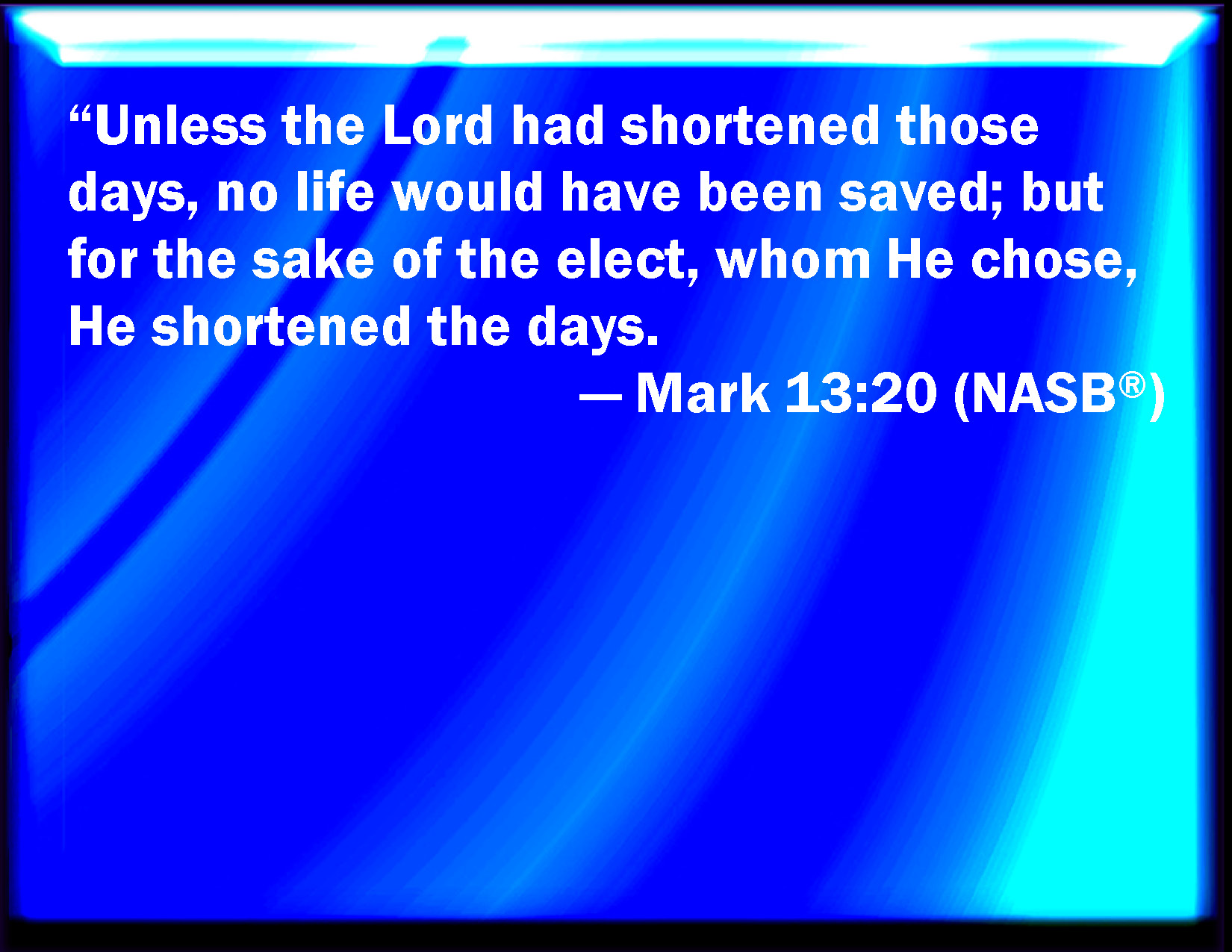 Bible Verse Slide Mark 13:20 And except that the Lord had shortened those days, no flesh should be saved: but for the elect's sake, whom he has chosen, he has shortened the days. KJV: And except that the Lord had shortened those days, no flesh should be saved: but for the elect's sake, whom he hath chosen, he hath shortened the days. DRB: And unless the Lord had shortened the days, no flesh should be saved: but for the sake of the elect which he hath chosen, he hath shortened the days. DBT: and if the Lord had not cut short those days, no flesh should have been saved; but on account of the elect whom he has chosen, he has cut short those days. ERV: And except the Lord had shortened the days, no flesh would have been saved: but for the elect's sake, whom he chose, he shortened the days. WBT: And except the Lord had shortened those days, no flesh would be saved: but for the elect's sake, whom he hath chosen, he hath shortened the days. WEB: Unless the Lord had shortened the days, no flesh would have been saved; but for the sake of the chosen ones, whom he picked out, he shortened the days. YLT: and if the Lord did not shorten the days, no flesh had been saved; but because of the chosen, whom He did choose to Himself, He did shorten the days.Links Mark 13:20 NIV • Mark 13:20 NLT • Mark 13:20 ESV • Mark 13:20 NASB • Mark 13:20 KJV • Mark 13:20 Interlinear • Mark 13:20 Commentaries • Mark 13:20 Parallel Texts • Mark 13:20 Bible Apps • Mark 13:20 Parallel • Bible Hub |