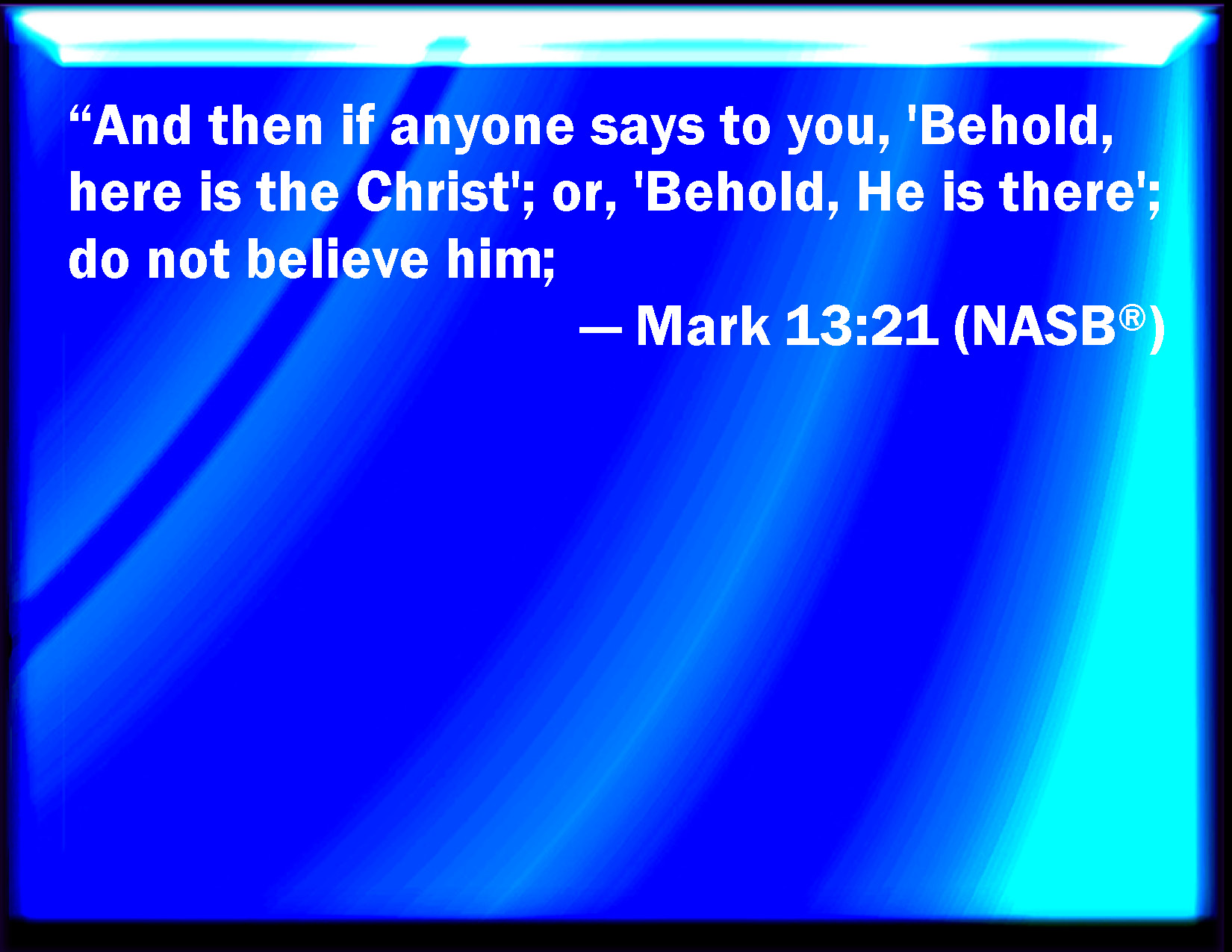 Bible Verse Slide Mark 13:21 And then if any man shall say to you, See, here is Christ; or, see, he is there; believe him not: KJV: And then if any man shall say to you, Lo, here is Christ; or, lo, he is there; believe him not: DRB: And then if any man shall say to you, Lo, here is Christ; lo, he is here: do not believe. DBT: And then if any one say to you, Lo, here is the Christ, or Lo, there, believe it not. ERV: And then if any man shall say unto you, Lo, here is the Christ; or, Lo, there; believe it not: WBT: And then, if any man shall say to you, Lo, here is Christ; or lo, he is there; believe him not. WEB: Then if anyone tells you, 'Look, here is the Christ!' or, 'Look, there!' don't believe it. YLT: And then, if any may say to you, Lo, here is the Christ, or, Lo, there, ye may not believe;Links Mark 13:21 NIV • Mark 13:21 NLT • Mark 13:21 ESV • Mark 13:21 NASB • Mark 13:21 KJV • Mark 13:21 Interlinear • Mark 13:21 Commentaries • Mark 13:21 Parallel Texts • Mark 13:21 Bible Apps • Mark 13:21 Parallel • Bible Hub |
