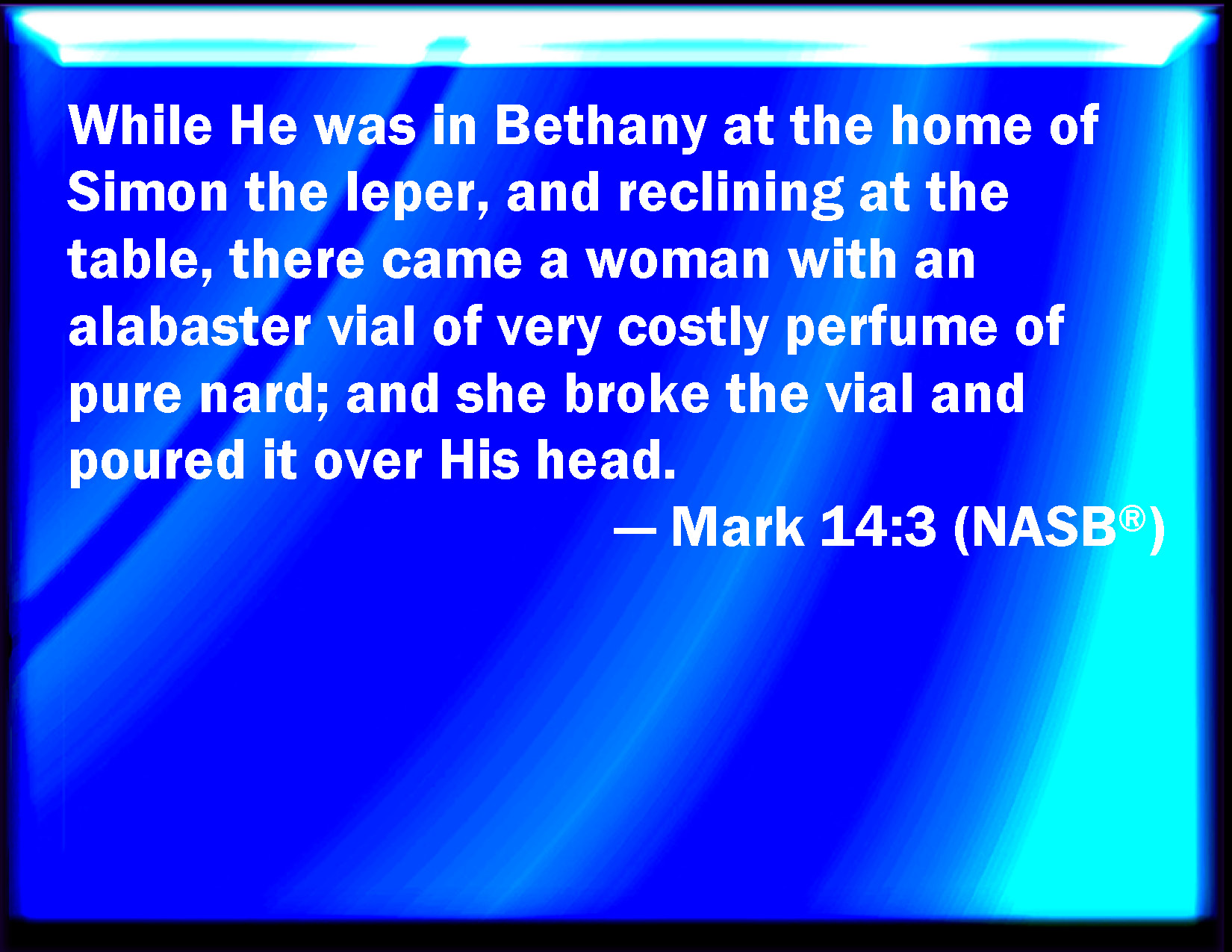 Bible Verse Slide Mark 14:3 And being in Bethany in the house of Simon the leper, as he sat at meat, there came a woman having an alabaster box of ointment of spikenard very precious; and she broke the box, and poured it on his head. KJV: And being in Bethany in the house of Simon the leper, as he sat at meat, there came a woman having an alabaster box of ointment of spikenard very precious; and she brake the box, and poured it on his head. DRB: And when he was in Bethania, in the house of Simon the leper, and was at meat, there came a woman having an alabaster box of ointment of precious spikenard: and breaking the alabaster box, she poured it out upon his head. DBT: And when he was in Bethany, in the house of Simon the leper, as he lay at table, there came a woman having an alabaster flask of ointment of pure nard, very costly; and having broken the alabaster flask, she poured it out upon his head. ERV: And while he was in Bethany in the house of Simon the leper, as he sat at meat, there came a woman having an alabaster cruse of ointment of spikenard very costly; and she brake the cruse, and poured it over his head. WBT: And being in Bethany, in the house of Simon the leper, as he sat at table, there came a woman having an alabaster box of ointment of spikenard, very precious; and she broke the box, and poured it on his head. WEB: While he was at Bethany, in the house of Simon the leper, as he sat at the table, a woman came having an alabaster jar of ointment of pure nard—very costly. She broke the jar, and poured it over his head. YLT: And he, being in Bethany, in the house of Simon the leper, at his reclining (at meat), there came a woman having an alabaster box of ointment, of spikenard, very precious, and having broken the alabaster box, did pour on his head;Links Mark 14:3 NIV • Mark 14:3 NLT • Mark 14:3 ESV • Mark 14:3 NASB • Mark 14:3 KJV • Mark 14:3 Interlinear • Mark 14:3 Commentaries • Mark 14:3 Parallel Texts • Mark 14:3 Bible Apps • Mark 14:3 Parallel • Bible Hub |