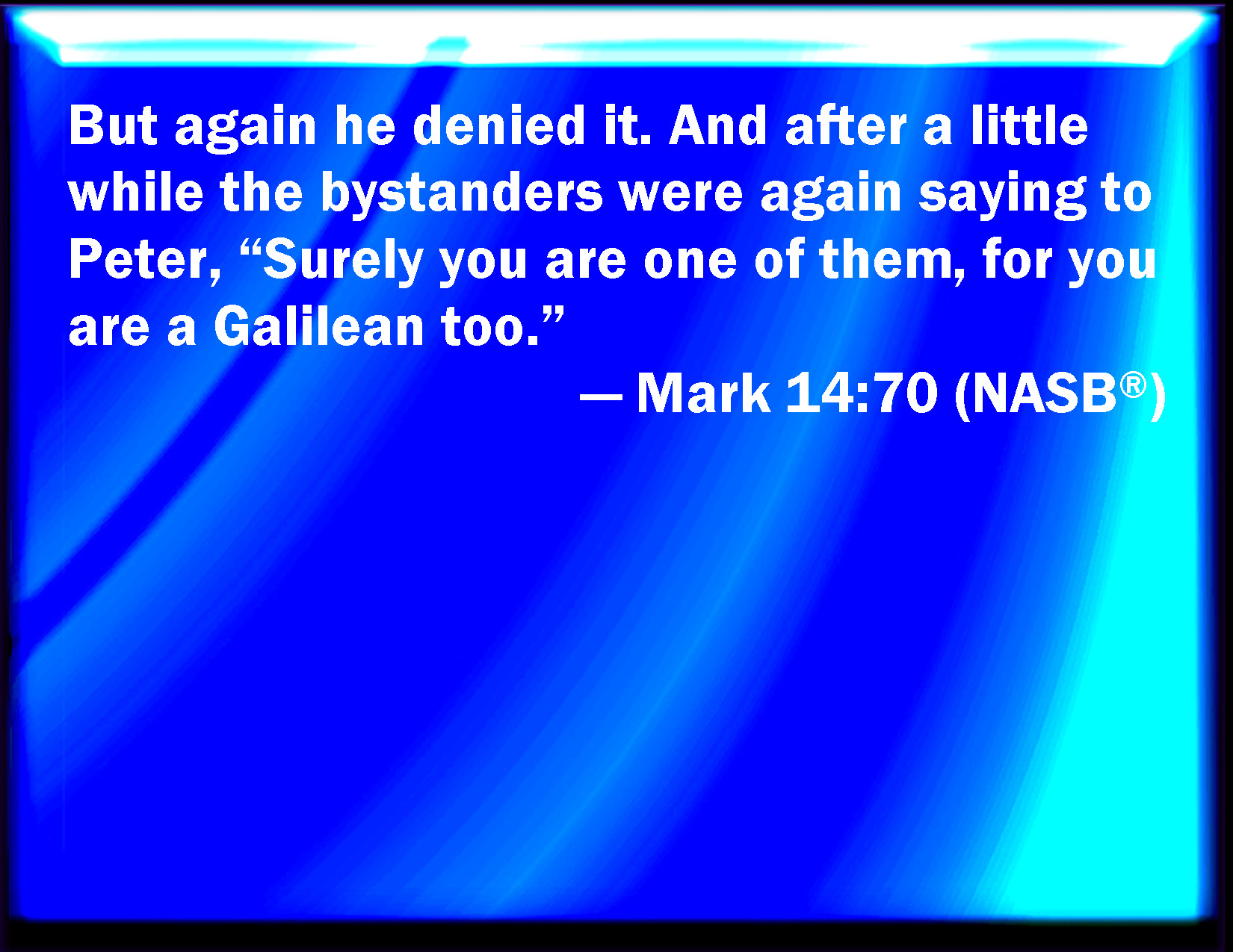 Bible Verse Slide Mark 14:70 And he denied it again. And a little after, they that stood by said again to Peter, Surely you are one of them: for you are a Galilaean, and your speech agrees thereto. KJV: And he denied it again. And a little after, they that stood by said again to Peter, Surely thou art one of them: for thou art a Galilaean, and thy speech agreeth thereto. DRB: But he denied again. And after a while they that stood by said again to Peter: Surely thou art one of them; for thou art also a Galilean. DBT: And he again denied. And again, after a little, those that stood by said to Peter, Truly thou art one of them, for also thou art a Galilean. ERV: But he again denied it. And after a little while again they that stood by said to Peter, Of a truth thou art one of them; for thou art a Galilaean. WBT: And he denied it again. And a little after, they that stood by said again to Peter, Surely thou art one of them: for thou art a Galilean, and thy speech agreeth thereto. WEB: But he again denied it. After a little while again those who stood by said to Peter, "You truly are one of them, for you are a Galilean, and your speech shows it." YLT: and he was again denying. And after a little again, those standing near said to Peter, 'Truly thou art of them, for thou also art a Galilean, and thy speech is alike;'Links Mark 14:70 NIV • Mark 14:70 NLT • Mark 14:70 ESV • Mark 14:70 NASB • Mark 14:70 KJV • Mark 14:70 Interlinear • Mark 14:70 Commentaries • Mark 14:70 Parallel Texts • Mark 14:70 Bible Apps • Mark 14:70 Parallel • Bible Hub |