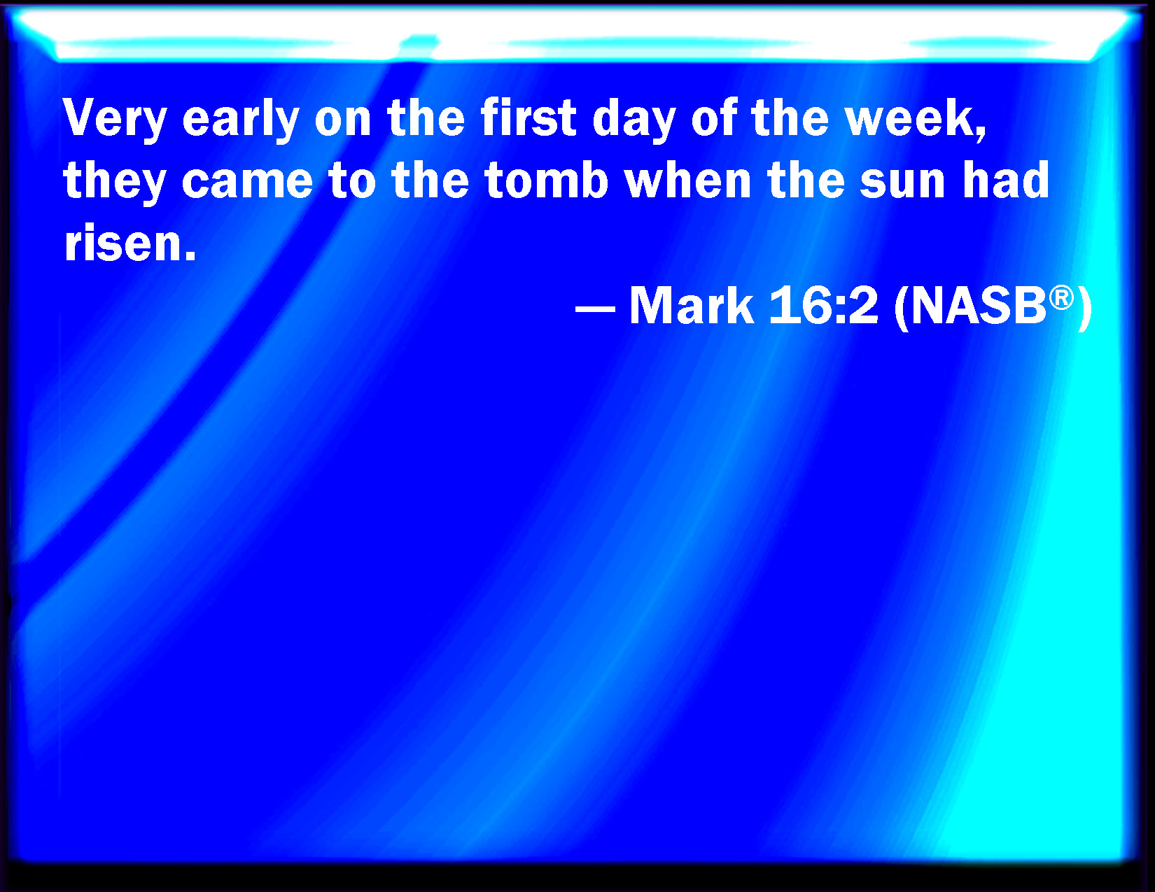 Bible Verse Slide Mark 16:2 And very early in the morning the first day of the week, they came to the sepulcher at the rising of the sun. KJV: And very early in the morning the first day of the week, they came unto the sepulchre at the rising of the sun. DRB: And very early in the morning, the first day of the week, they come to the sepulchre, the sun being now risen. DBT: And very early on the first day of the week they come to the sepulchre, the sun having risen. ERV: And very early on the first day of the week, they come to the tomb when the sun was risen. WBT: And very early in the morning, the first day of the week, they came to the sepulcher at the rising of the sun: WEB: Very early on the first day of the week, they came to the tomb when the sun had risen. YLT: and early in the morning of the first of the sabbaths, they come unto the sepulchre, at the rising of the sun,Links Mark 16:2 NIV • Mark 16:2 NLT • Mark 16:2 ESV • Mark 16:2 NASB • Mark 16:2 KJV • Mark 16:2 Interlinear • Mark 16:2 Commentaries • Mark 16:2 Parallel Texts • Mark 16:2 Bible Apps • Mark 16:2 Parallel • Bible Hub |