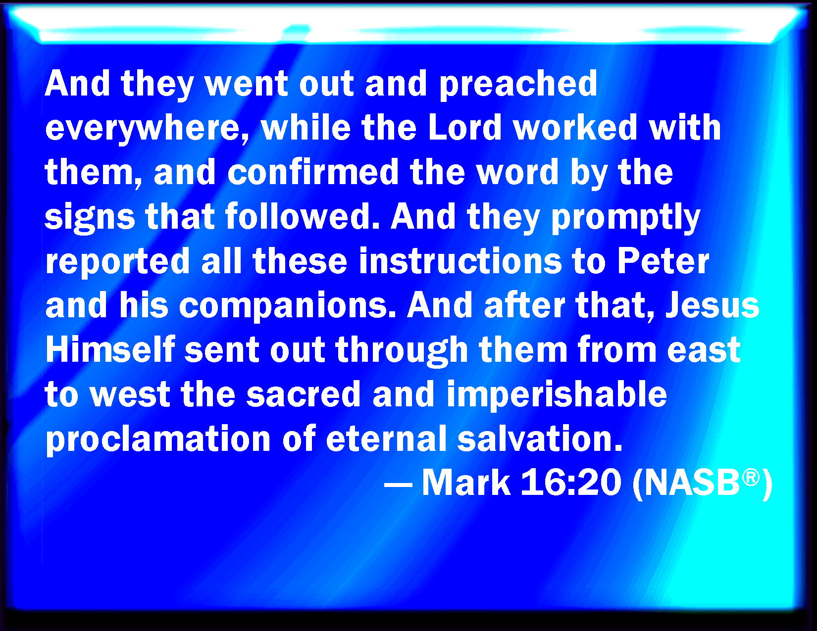 Bible Verse Slide Mark 16:20 And they went forth, and preached every where, the Lord working with them, and confirming the word with signs following. Amen. KJV: And they went forth, and preached every where, the Lord working with them, and confirming the word with signs following. Amen. DRB: But they going forth preached every where: the Lord working withal, and confirming the word with signs that followed. DBT: And they, going forth, preached everywhere, the Lord working with them, and confirming the word by the signs following upon it. ERV: And they went forth, and preached everywhere, the Lord working with them, and confirming the word by the signs that followed. Amen. WBT: And they went forth, and preached every where, the Lord working with them, and confirming the word with signs following. Amen. WEB: They went out, and preached everywhere, the Lord working with them, and confirming the word by the signs that followed. Amen. YLT: and they, having gone forth, did preach everywhere, the Lord working with them, and confirming the word, through the signs following. Amen.Links Mark 16:20 NIV • Mark 16:20 NLT • Mark 16:20 ESV • Mark 16:20 NASB • Mark 16:20 KJV • Mark 16:20 Interlinear • Mark 16:20 Commentaries • Mark 16:20 Parallel Texts • Mark 16:20 Bible Apps • Mark 16:20 Parallel • Bible Hub |