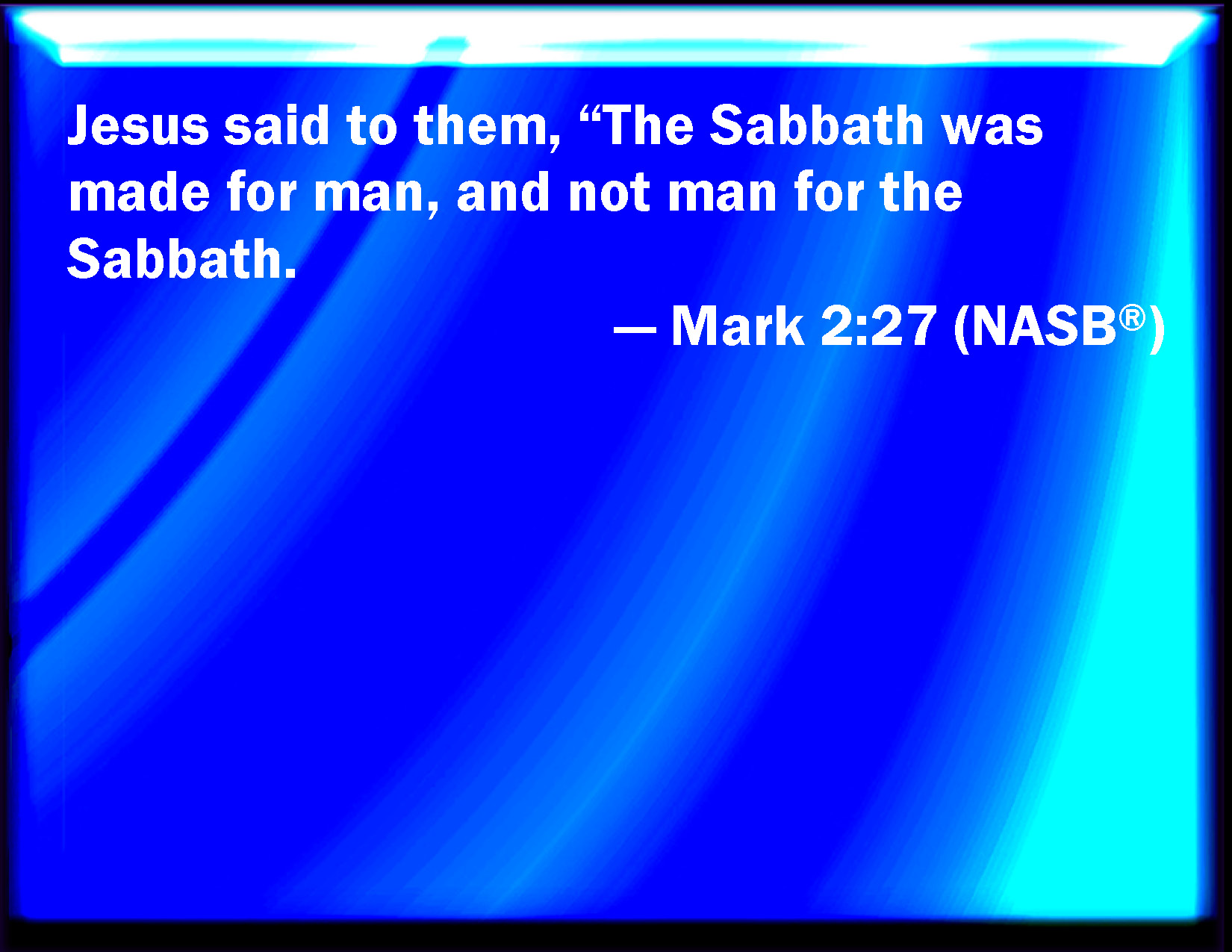 Bible Verse Slide Mark 2:27 And he said to them, The sabbath was made for man, and not man for the sabbath: KJV: And he said unto them, The sabbath was made for man, and not man for the sabbath: DRB: And he said to them: The sabbath was made for man, and not man for the sabbath. DBT: And he said to them, The sabbath was made on account of man, not man on account of the sabbath; ERV: And he said unto them, The sabbath was made for man, and not man for the sabbath: WBT: And he said to them, The sabbath was made for man, and not man for the sabbath: WEB: He said to them, "The Sabbath was made for man, not man for the Sabbath. YLT: And he said to them, 'The sabbath for man was made, not man for the sabbath,Links Mark 2:27 NIV • Mark 2:27 NLT • Mark 2:27 ESV • Mark 2:27 NASB • Mark 2:27 KJV • Mark 2:27 Interlinear • Mark 2:27 Commentaries • Mark 2:27 Parallel Texts • Mark 2:27 Bible Apps • Mark 2:27 Parallel • Bible Hub |