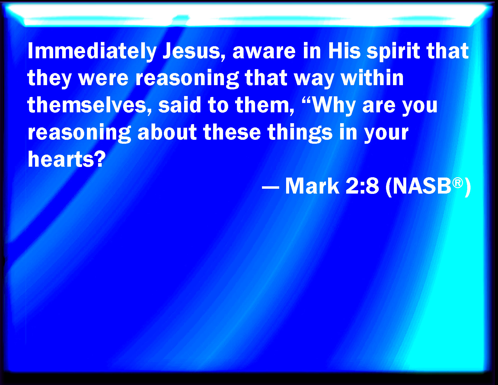 Bible Verse Slide Mark 2:8 And immediately when Jesus perceived in his spirit that they so reasoned within themselves, he said to them, Why reason you these things in your hearts? KJV: And immediately when Jesus perceived in his spirit that they so reasoned within themselves, he said unto them, Why reason ye these things in your hearts? DRB: Which Jesus presently knowing in his spirit, that they so thought within themselves, saith to them: Why think you these things in your hearts? DBT: And straightway Jesus, knowing in his spirit that they are reasoning thus within themselves, said to them, Why reason ye these things in your hearts? ERV: And straightway Jesus, perceiving in his spirit that they so reasoned within themselves, saith unto them, Why reason ye these things in your hearts? WBT: And immediately, when Jesus perceived in his spirit that they so reasoned within themselves, he said to them, Why reason ye these things in your hearts? WEB: Immediately Jesus, perceiving in his spirit that they so reasoned within themselves, said to them, "Why do you reason these things in your hearts? YLT: And immediately Jesus, having known in his spirit that they thus reason in themselves, said to them, 'Why these things reason ye in your hearts?Links Mark 2:8 NIV • Mark 2:8 NLT • Mark 2:8 ESV • Mark 2:8 NASB • Mark 2:8 KJV • Mark 2:8 Interlinear • Mark 2:8 Commentaries • Mark 2:8 Parallel Texts • Mark 2:8 Bible Apps • Mark 2:8 Parallel • Bible Hub |