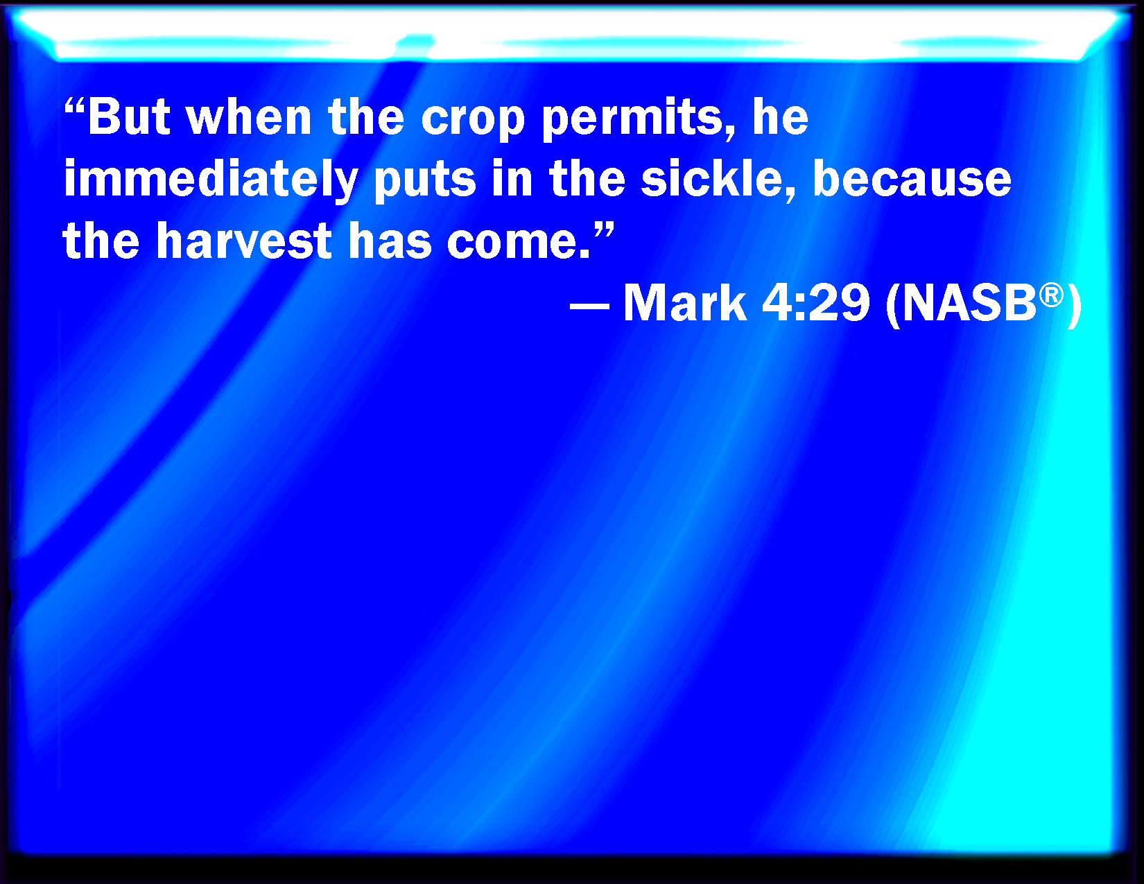 Bible Verse Slide Mark 4:29 But when the fruit is brought forth, immediately he puts in the sickle, because the harvest is come. KJV: But when the fruit is brought forth, immediately he putteth in the sickle, because the harvest is come. DRB: And when the fruit is brought forth, immediately he putteth in the sickle, because the harvest is come. DBT: But when the fruit is produced, immediately he sends the sickle, for the harvest is come. ERV: But when the fruit is ripe, straightway he putteth forth the sickle, because the harvest is come. WBT: But when the fruit is brought forth, immediately he putteth in the sickle, because the harvest is come. WEB: But when the fruit is ripe, immediately he puts forth the sickle, because the harvest has come." YLT: and whenever the fruit may yield itself, immediately he doth send forth the sickle, because the harvest hath come.'Links Mark 4:29 NIV • Mark 4:29 NLT • Mark 4:29 ESV • Mark 4:29 NASB • Mark 4:29 KJV • Mark 4:29 Interlinear • Mark 4:29 Commentaries • Mark 4:29 Parallel Texts • Mark 4:29 Bible Apps • Mark 4:29 Parallel • Bible Hub |