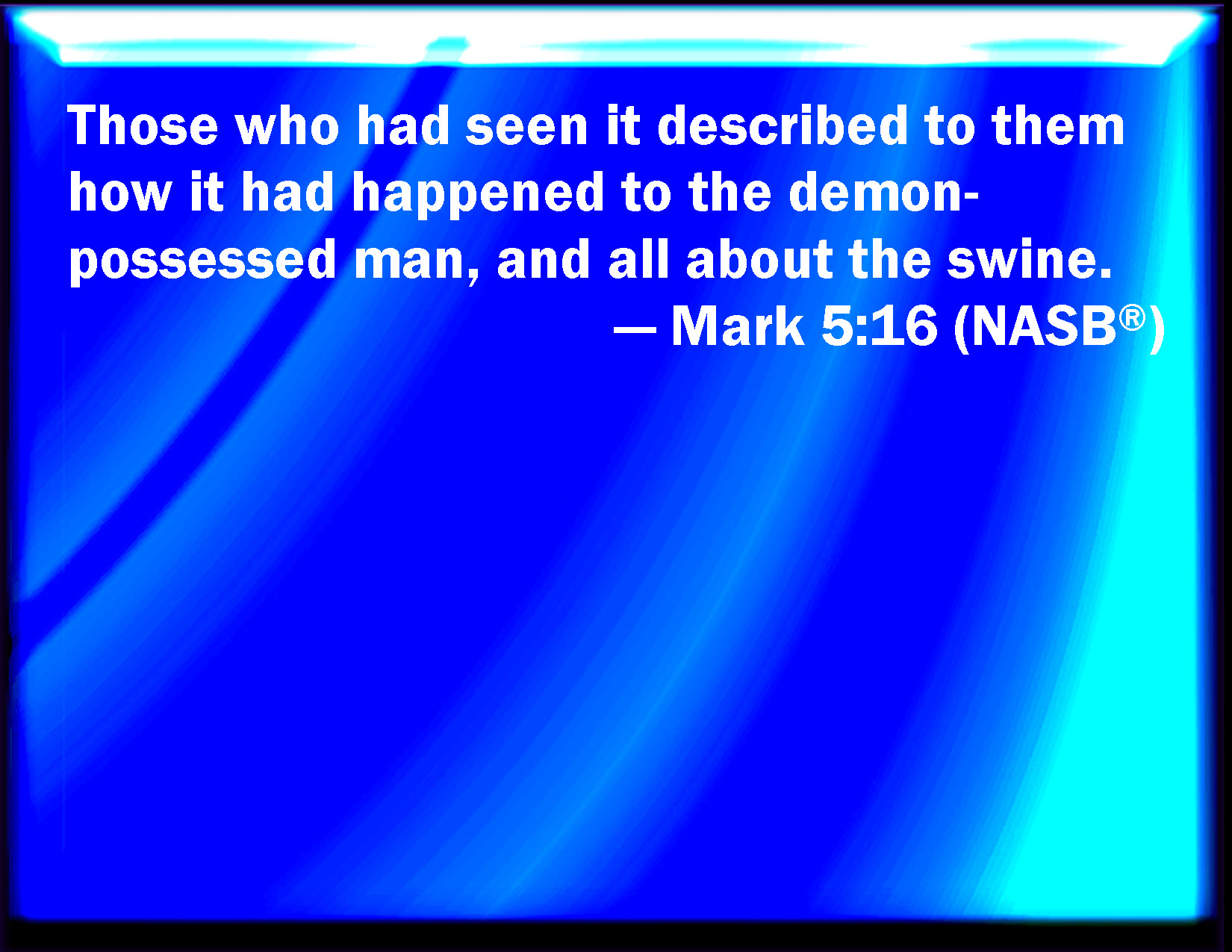 Bible Verse Slide Mark 5:16 And they that saw it told them how it befell to him that was possessed with the devil, and also concerning the swine. KJV: And they that saw it told them how it befell to him that was possessed with the devil, and also concerning the swine. DRB: And they that had seen it, told them, in what manner he had been dealt with who had the devil; and concerning the swine. DBT: And they that had seen it related to them how it had happened to the man possessed by demons, and concerning the swine. ERV: And they that saw it declared unto them how it befell him that was possessed with devils, and concerning the swine. WBT: And they that saw it told them how it befell him that was possessed with the demon, and also concerning the swine. WEB: Those who saw it declared to them how it happened to him who was possessed by demons, and about the pigs. YLT: and those having seen it, declared to them how it had come to pass to the demoniac, and about the swine;Links Mark 5:16 NIV • Mark 5:16 NLT • Mark 5:16 ESV • Mark 5:16 NASB • Mark 5:16 KJV • Mark 5:16 Interlinear • Mark 5:16 Commentaries • Mark 5:16 Parallel Texts • Mark 5:16 Bible Apps • Mark 5:16 Parallel • Bible Hub |