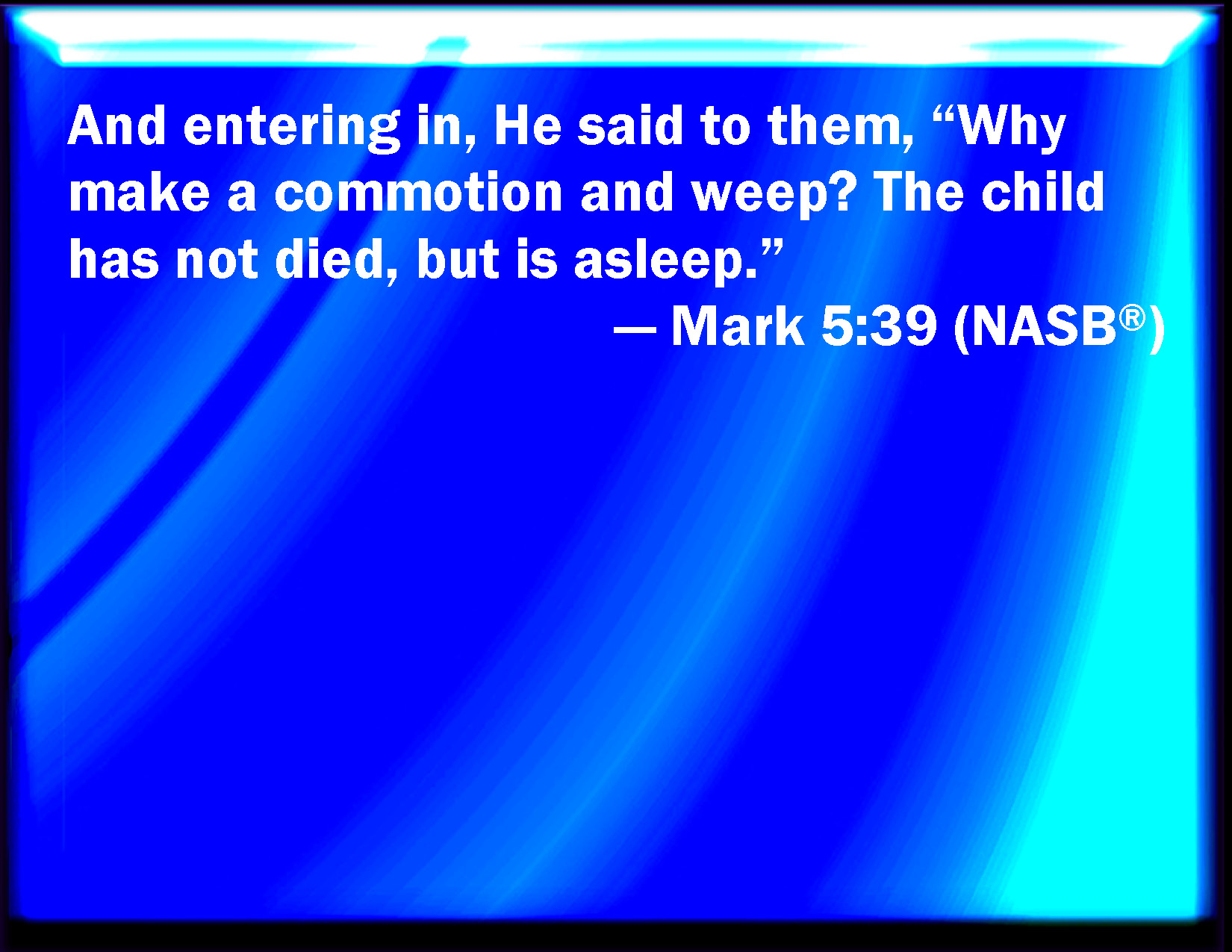 Bible Verse Slide Mark 5:39 And when he was come in, he said to them, Why make you this ado, and weep? the damsel is not dead, but sleeps. KJV: And when he was come in, he saith unto them, Why make ye this ado, and weep? the damsel is not dead, but sleepeth. DRB: And going in, he saith to them: Why make you this ado, and weep? the damsel is not dead, but sleepeth. DBT: And entering in he says to them, Why do ye make a tumult and weep? the child has not died, but sleeps. ERV: And when he was entered in, he saith unto them, Why make ye a tumult, and weep? the child is not dead, but sleepeth. WBT: And when he had come in, he saith to them, Why make ye this tumult, and weep? the damsel is not dead, but sleepeth. WEB: When he had entered in, he said to them, "Why do you make an uproar and weep? The child is not dead, but is asleep." YLT: and having gone in he saith to them, 'Why do ye make a tumult, and weep? the child did not die, but doth sleep;Links Mark 5:39 NIV • Mark 5:39 NLT • Mark 5:39 ESV • Mark 5:39 NASB • Mark 5:39 KJV • Mark 5:39 Interlinear • Mark 5:39 Commentaries • Mark 5:39 Parallel Texts • Mark 5:39 Bible Apps • Mark 5:39 Parallel • Bible Hub |