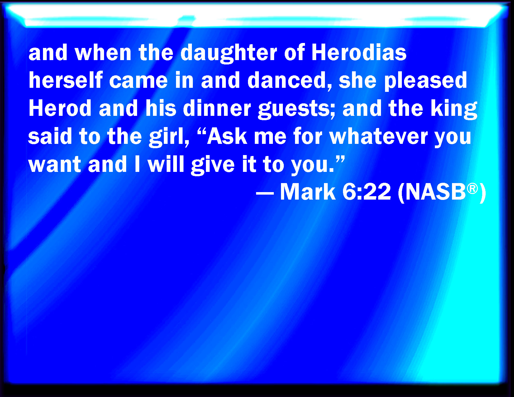 Bible Verse Slide Mark 6:22 And when the daughter of the said Herodias came in, and danced, and pleased Herod and them that sat with him, the king said to the damsel, Ask of me whatever you will, and I will give it you. KJV: And when the daughter of the said Herodias came in, and danced, and pleased Herod and them that sat with him, the king said unto the damsel, Ask of me whatsoever thou wilt, and I will give it thee. DRB: And when the daughter of the same Herodias had come in, and had danced, and pleased Herod, and them that were at table with him, the king said to the damsel: Ask of me what thou wilt, and I will give it thee. DBT: and the daughter of the same Herodias having come in, and danced, pleased Herod and those that were with him at table; and the king said to the damsel, Ask of me whatsoever thou wilt and I will give it thee. ERV: and when the daughter of Herodias herself came in and danced, she pleased Herod and them that sat at meat with him; and the king said unto the damsel, Ask of me whatsoever thou wilt, and I will give it thee. WBT: And when the daughter of the said Herodias came in, and danced, and pleased Herod, and them that sat with him, the king said to the damsel, Ask of me whatever thou wilt, and I will give it thee. WEB: When the daughter of Herodias herself came in and danced, she pleased Herod and those sitting with him. The king said to the young lady, "Ask me whatever you want, and I will give it to you." YLT: and the daughter of that Herodias having come in, and having danced, and having pleased Herod and those reclining (at meat) with him, the king said to the damsel, 'Ask of me whatever thou wilt, and I will give to thee,'Links Mark 6:22 NIV • Mark 6:22 NLT • Mark 6:22 ESV • Mark 6:22 NASB • Mark 6:22 KJV • Mark 6:22 Interlinear • Mark 6:22 Commentaries • Mark 6:22 Parallel Texts • Mark 6:22 Bible Apps • Mark 6:22 Parallel • Bible Hub |