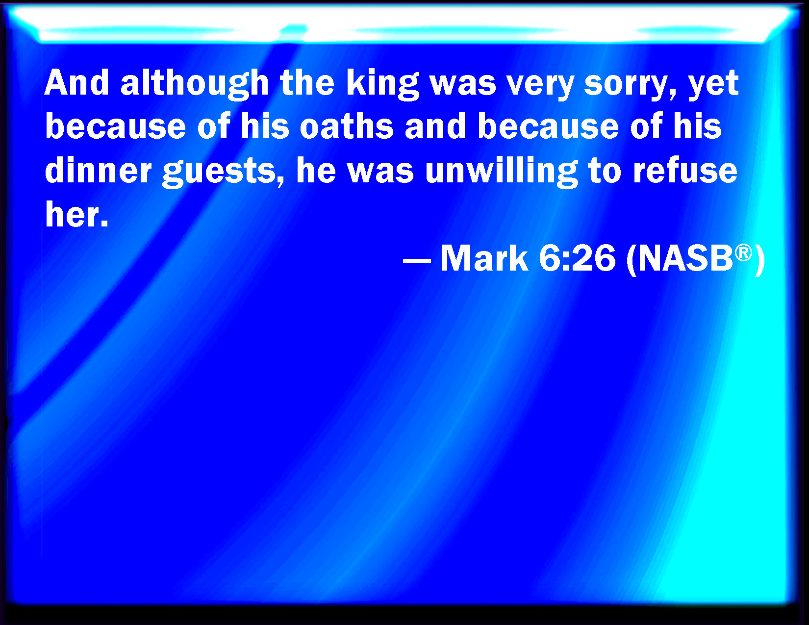 Bible Verse Slide Mark 6:26 And the king was exceeding sorry; yet for his oath's sake, and for their sakes which sat with him, he would not reject her. KJV: And the king was exceeding sorry; yet for his oath's sake, and for their sakes which sat with him, he would not reject her. DRB: And the king was struck sad. Yet because of his oath, and because of them that were with him at table, he would not displease her: DBT: And the king, while made very sorry, on account of the oaths and those lying at table with him would not break his word with her. ERV: And the king was exceeding sorry; but for the sake of his oaths, and of them that sat at meat, he would not reject her. WBT: And the king was exceeding sorry: yet for his oath's sake, and for their sakes who sat with him, he would not reject her. WEB: The king was exceedingly sorry, but for the sake of his oaths, and of his dinner guests, he didn't wish to refuse her. YLT: And the king — made very sorrowful — because of the oaths and of those reclining (at meat) with him, would not put her away,Links Mark 6:26 NIV • Mark 6:26 NLT • Mark 6:26 ESV • Mark 6:26 NASB • Mark 6:26 KJV • Mark 6:26 Interlinear • Mark 6:26 Commentaries • Mark 6:26 Parallel Texts • Mark 6:26 Bible Apps • Mark 6:26 Parallel • Bible Hub |