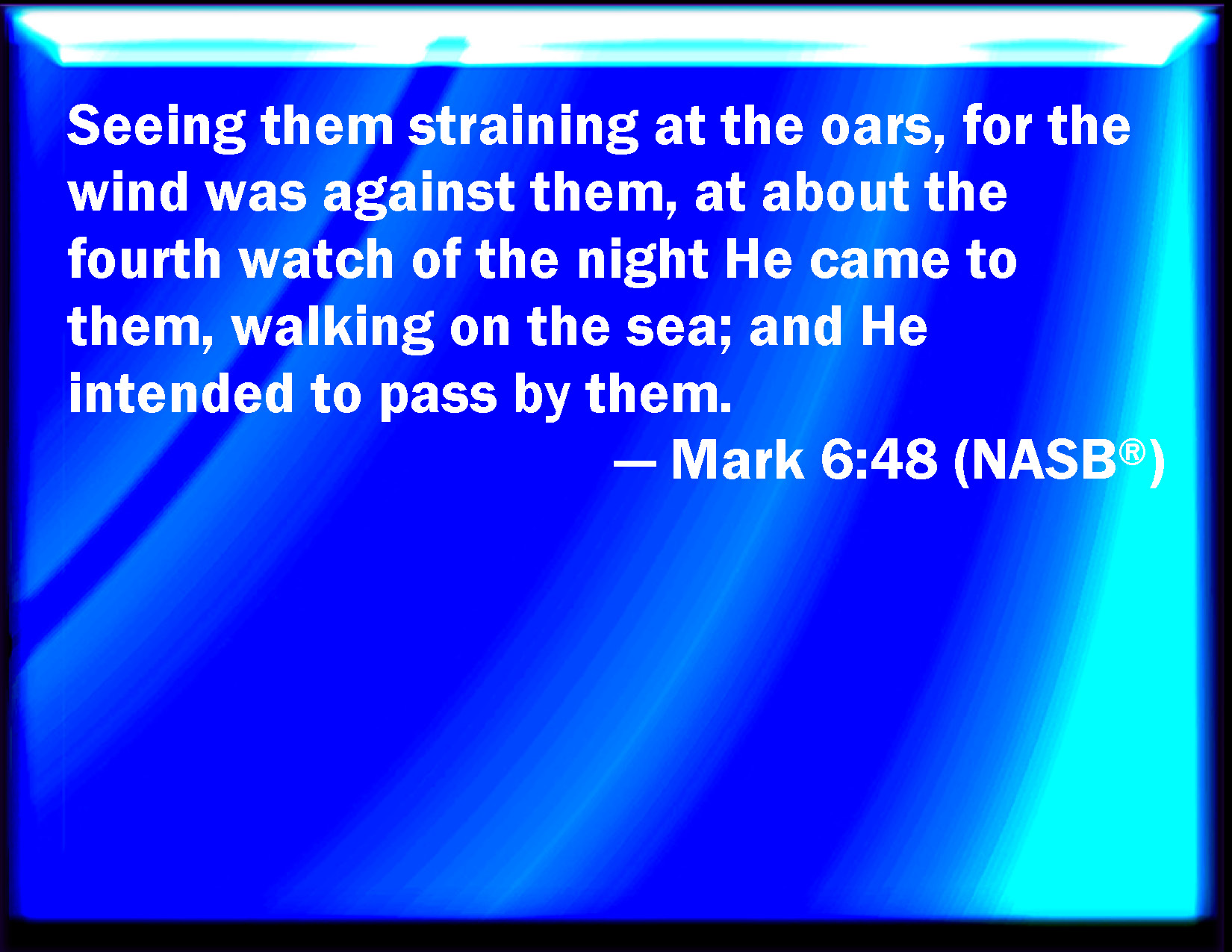 Bible Verse Slide Mark 6:48 And he saw them toiling in rowing; for the wind was contrary to them: and about the fourth watch of the night he comes to them, walking on the sea, and would have passed by them. KJV: And he saw them toiling in rowing; for the wind was contrary unto them: and about the fourth watch of the night he cometh unto them, walking upon the sea, and would have passed by them. DRB: And seeing them labouring in rowing, (for the wind was against them,) and about the fourth watch of the night, he cometh to them walking upon the sea, and he would have passed by them. DBT: And seeing them labouring in rowing, for the wind was contrary to them, about the fourth watch of the night he comes to them walking on the sea, and would have passed them by. ERV: And seeing them distressed in rowing, for the wind was contrary unto them, about the fourth watch of the night he cometh unto them, walking on the sea; and he would have passed by them: WBT: And he saw them toiling in rowing; for the wind was contrary to them: and about the fourth watch of the night he cometh to them, walking upon the sea, and would have passed by them. WEB: Seeing them distressed in rowing, for the wind was contrary to them, about the fourth watch of the night he came to them, walking on the sea, and he would have passed by them, YLT: and he saw them harassed in the rowing, for the wind was against them, and about the fourth watch of the night he doth come to them walking on the sea, and wished to pass by them.Links Mark 6:48 NIV • Mark 6:48 NLT • Mark 6:48 ESV • Mark 6:48 NASB • Mark 6:48 KJV • Mark 6:48 Interlinear • Mark 6:48 Commentaries • Mark 6:48 Parallel Texts • Mark 6:48 Bible Apps • Mark 6:48 Parallel • Bible Hub |