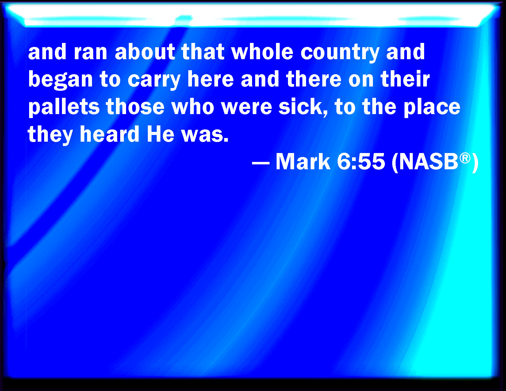 Bible Verse Slide Mark 6:55 And ran through that whole region round about, and began to carry about in beds those that were sick, where they heard he was. KJV: And ran through that whole region round about, and began to carry about in beds those that were sick, where they heard he was. DRB: And running through that whole country, they began to carry about in beds those that were sick, where they heard he was. DBT: they ran through that whole country around, and began to carry about those that were ill on couches, where they heard that he was. ERV: and ran round about that whole region, and began to carry about on their beds those that were sick, where they heard he was. WBT: And ran through that whole region around, and began to carry about in beds those that were sick, where they heard he was. WEB: and ran around that whole region, and began to bring those who were sick, on their mats, to where they heard he was. YLT: having run about through all that region round about, they began upon the couches to carry about those ill, where they were hearing that he is,Links Mark 6:55 NIV • Mark 6:55 NLT • Mark 6:55 ESV • Mark 6:55 NASB • Mark 6:55 KJV • Mark 6:55 Interlinear • Mark 6:55 Commentaries • Mark 6:55 Parallel Texts • Mark 6:55 Bible Apps • Mark 6:55 Parallel • Bible Hub |