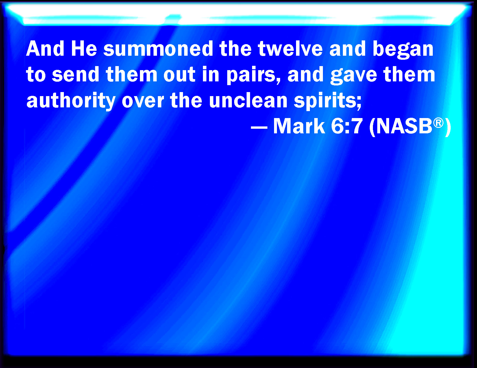 Bible Verse Slide Mark 6:7 And he called to him the twelve, and began to send them forth by two and two; and gave them power over unclean spirits; KJV: And he called unto him the twelve, and began to send them forth by two and two; and gave them power over unclean spirits; DRB: And he called the twelve; and began to send them two and two, and gave them power over unclean spirits. DBT: And he calls the twelve to him; and he began to send them out two and two, and gave to them power over the unclean spirits; ERV: And he called unto him the twelve, and began to send them forth by two and two; and he gave them authority over the unclean spirits; WBT: And he calleth to him the twelve, and began to send them forth by two and two; and gave them power over unclean spirits; WEB: He called to himself the twelve, and began to send them out two by two; and he gave them authority over the unclean spirits. YLT: and he doth call near the twelve, and he began to send them forth two by two, and he was giving them power over the unclean spirits,Links Mark 6:7 NIV • Mark 6:7 NLT • Mark 6:7 ESV • Mark 6:7 NASB • Mark 6:7 KJV • Mark 6:7 Interlinear • Mark 6:7 Commentaries • Mark 6:7 Parallel Texts • Mark 6:7 Bible Apps • Mark 6:7 Parallel • Bible Hub |