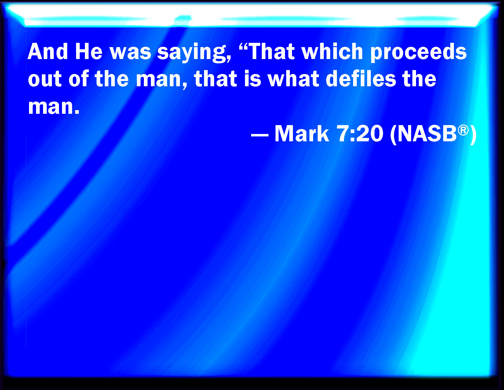 Bible Verse Slide Mark 7:20 And he said, That which comes out of the man, that defiles the man. KJV: And he said, That which cometh out of the man, that defileth the man. DRB: But he said that the things which come out from a man, they defile a man. DBT: And he said, That which goes forth out of the man, that defiles the man. ERV: And he said, That which proceedeth out of the man, that defileth the man. WBT: And he said, That which cometh out of the man, that defileth the man. WEB: He said, "That which proceeds out of the man, that defiles the man. YLT: And he said — 'That which is coming out from the man, that doth defile the man;Links Mark 7:20 NIV • Mark 7:20 NLT • Mark 7:20 ESV • Mark 7:20 NASB • Mark 7:20 KJV • Mark 7:20 Interlinear • Mark 7:20 Commentaries • Mark 7:20 Parallel Texts • Mark 7:20 Bible Apps • Mark 7:20 Parallel • Bible Hub |