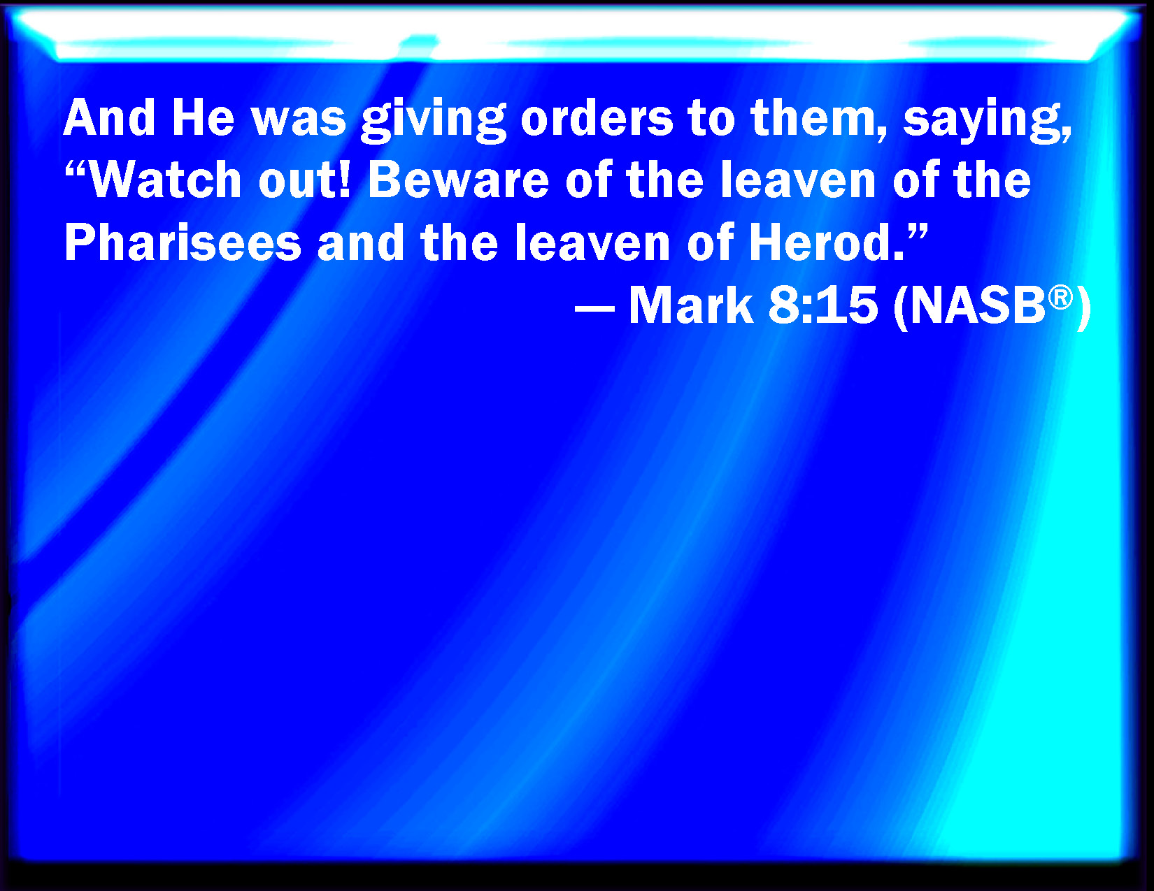 Bible Verse Slide Mark 8:15 And he charged them, saying, Take heed, beware of the leaven of the Pharisees, and of the leaven of Herod. KJV: And he charged them, saying, Take heed, beware of the leaven of the Pharisees, and of the leaven of Herod. DRB: And he charged them, saying: Take heed and beware of the leaven of the Pharisees, and of the leaven of Herod. DBT: And he charged them, saying, Take heed, beware of the leaven of the Pharisees and of the leaven of Herod. ERV: And he charged them, saying, Take heed, beware of the leaven of the Pharisees and the leaven of Herod. WBT: And he charged them saying, Take heed, beware of the leaven of the Pharisees, and of the leaven of Herod. WEB: He warned them, saying, "Take heed: beware of the yeast of the Pharisees and the yeast of Herod." YLT: and he was charging them, saying, 'Take heed, beware of the leaven of the Pharisees, and of the leaven of Herod,'Links Mark 8:15 NIV • Mark 8:15 NLT • Mark 8:15 ESV • Mark 8:15 NASB • Mark 8:15 KJV • Mark 8:15 Interlinear • Mark 8:15 Commentaries • Mark 8:15 Parallel Texts • Mark 8:15 Bible Apps • Mark 8:15 Parallel • Bible Hub |