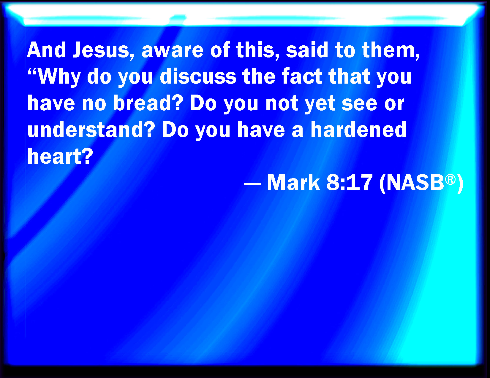 Bible Verse Slide Mark 8:17 And when Jesus knew it, he said to them, Why reason you, because you have no bread? perceive you not yet, neither understand? have you your heart yet hardened? KJV: And when Jesus knew it, he saith unto them, Why reason ye, because ye have no bread? perceive ye not yet, neither understand? have ye your heart yet hardened? DRB: Which Jesus knowing, saith to them: Why do you reason, because you have no bread? do you not yet know nor understand? have you still your heart blinded? DBT: And Jesus knowing it, says to them, Why reason ye because ye have no bread? Do ye not yet perceive nor understand? Have ye your heart yet hardened? ERV: And Jesus perceiving it saith unto them, Why reason ye, because ye have no bread? do ye not yet perceive, neither understand? have ye your heart hardened? WBT: And when Jesus knew it, he saith to them, Why reason ye, because ye have no bread? perceive ye not yet, neither understand? have ye your heart yet hardened? WEB: Jesus, perceiving it, said to them, "Why do you reason that it's because you have no bread? Don't you perceive yet, neither understand? Is your heart still hardened? YLT: And Jesus having known, saith to them, 'Why do ye reason, because ye have no loaves? do ye not yet perceive, nor understand, yet have ye your heart hardened?Links Mark 8:17 NIV • Mark 8:17 NLT • Mark 8:17 ESV • Mark 8:17 NASB • Mark 8:17 KJV • Mark 8:17 Interlinear • Mark 8:17 Commentaries • Mark 8:17 Parallel Texts • Mark 8:17 Bible Apps • Mark 8:17 Parallel • Bible Hub |