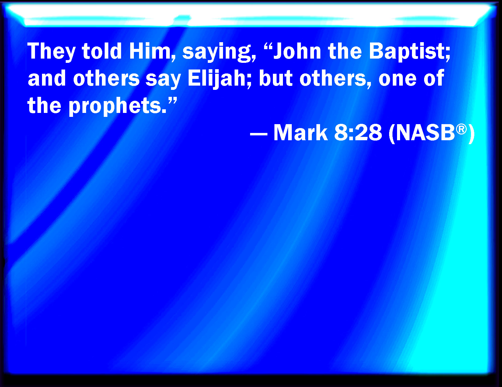 Bible Verse Slide Mark 8:28 And they answered, John the Baptist; but some say, Elias; and others, One of the prophets. KJV: And they answered, John the Baptist: but some say, Elias; and others, One of the prophets. DRB: Who answered him, saying: John the Baptist; but some Elias, and others as one of the prophets. DBT: And they answered him, saying, John the baptist; and others, Elias; but others, One of the prophets. ERV: And they told him, saying, John the Baptist: and others, Elijah; but others, One of the prophets. WBT: And they answered, John the Baptist: but some say, Elijah; and others, One of the prophets, WEB: They told him, "John the Baptizer, and others say Elijah, but others: one of the prophets." YLT: And they answered, 'John the Baptist, and others Elijah, but others one of the prophets.'Links Mark 8:28 NIV • Mark 8:28 NLT • Mark 8:28 ESV • Mark 8:28 NASB • Mark 8:28 KJV • Mark 8:28 Interlinear • Mark 8:28 Commentaries • Mark 8:28 Parallel Texts • Mark 8:28 Bible Apps • Mark 8:28 Parallel • Bible Hub |