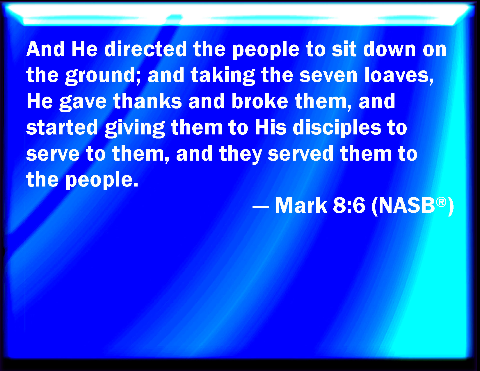 Bible Verse Slide Mark 8:6 And he commanded the people to sit down on the ground: and he took the seven loaves, and gave thanks, and broke, and gave to his disciples to set before them; and they did set them before the people. KJV: And he commanded the people to sit down on the ground: and he took the seven loaves, and gave thanks, and brake, and gave to his disciples to set before them; and they did set them before the people. DRB: And taking the seven loaves, giving thanks, he broke, and gave to his disciples for to set before them; and they set them before the people. DBT: And he commanded the crowd to sit down on the ground. And having taken the seven loaves, he gave thanks, and broke them and gave them to his disciples, that they might set them before them; and they set them before the crowd. ERV: And he commandeth the multitude to sit down on the ground: and he took the seven loaves, and having given thanks, he brake, and gave to his disciples, to set before them; and they set them before the multitude. WBT: And he commanded the people to sit down on the ground: and he took the seven loaves, and gave thanks, and broke, and gave to his disciples to set before them; and they set them before the people. WEB: He commanded the multitude to sit down on the ground, and he took the seven loaves. Having given thanks, he broke them, and gave them to his disciples to serve, and they served the multitude. YLT: And he commanded the multitude to sit down upon the ground, and having taken the seven loaves, having given thanks, he brake, and was giving to his disciples that they may set before them; and they did set before the multitude.Links Mark 8:6 NIV • Mark 8:6 NLT • Mark 8:6 ESV • Mark 8:6 NASB • Mark 8:6 KJV • Mark 8:6 Interlinear • Mark 8:6 Commentaries • Mark 8:6 Parallel Texts • Mark 8:6 Bible Apps • Mark 8:6 Parallel • Bible Hub |