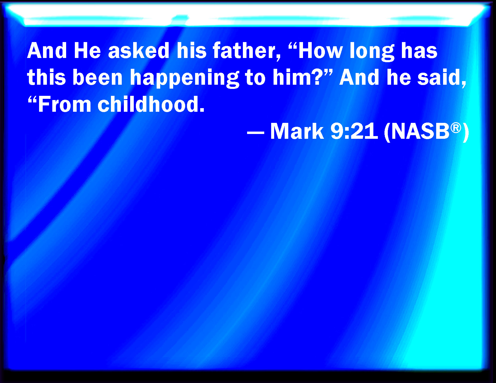 Bible Verse Slide Mark 9:21 And he asked his father, How long is it ago since this came to him? And he said, Of a child. KJV: And he asked his father, How long is it ago since this came unto him? And he said, Of a child. DRB: And he asked his father: How long time is it since this hath happened unto him? But he said: From his infancy: DBT: And he asked his father, How long a time is it that it has been like this with him? And he said, From childhood; ERV: And he asked his father, How long time is it since this hath come unto him? And he said, From a child. WBT: And he asked his father, How long is it since this came to him? and he said, From a child. WEB: He asked his father, "How long has it been since this has come to him?" He said, "From childhood. YLT: And he questioned his father, 'How long time is it since this came to him?' and he said, 'From childhood,Links Mark 9:21 NIV • Mark 9:21 NLT • Mark 9:21 ESV • Mark 9:21 NASB • Mark 9:21 KJV • Mark 9:21 Interlinear • Mark 9:21 Commentaries • Mark 9:21 Parallel Texts • Mark 9:21 Bible Apps • Mark 9:21 Parallel • Bible Hub |