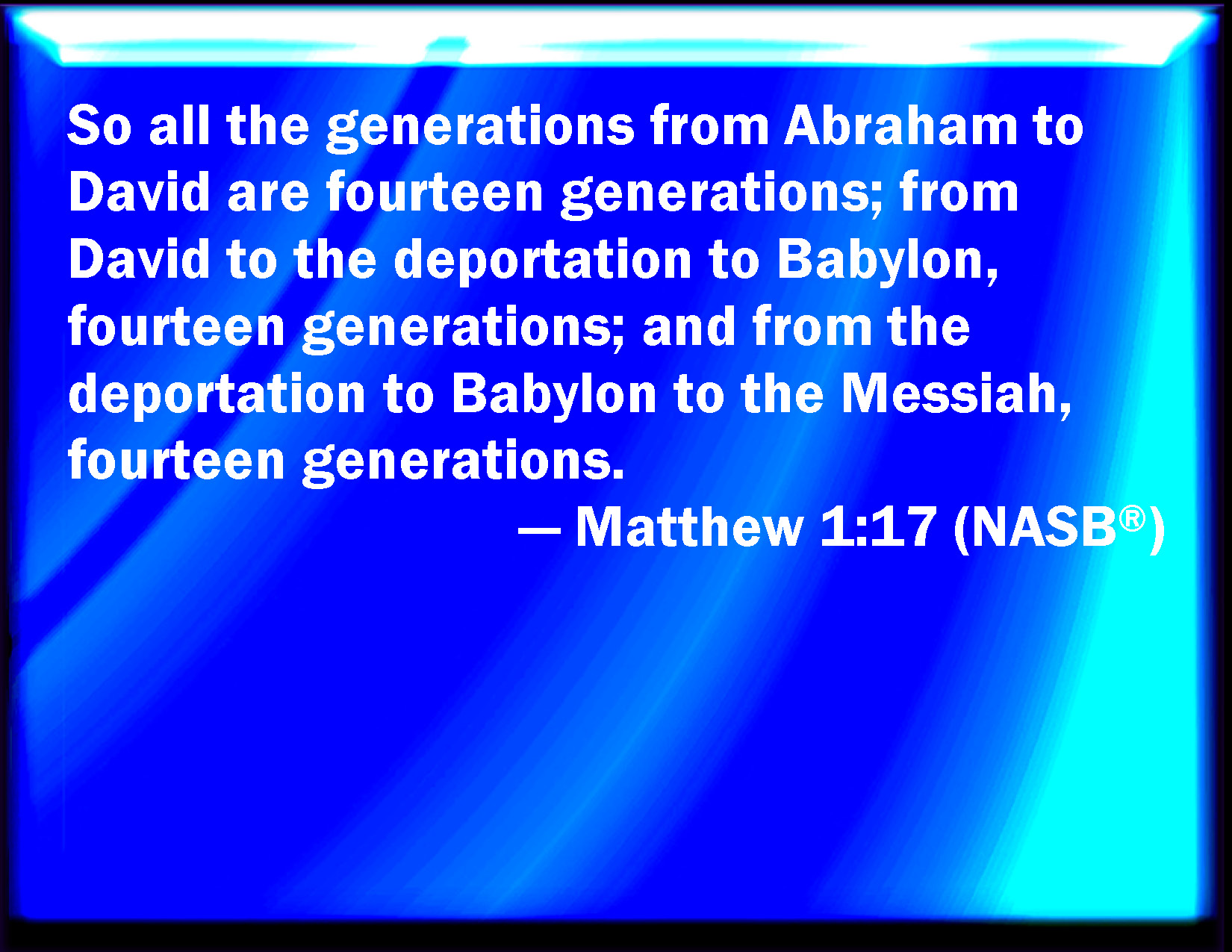 Bible Verse Slide Matthew 1:17 So all the generations from Abraham to David are fourteen generations; and from David until the carrying away into Babylon are fourteen generations; and from the carrying away into Babylon to Christ are fourteen generations. KJV: So all the generations from Abraham to David are fourteen generations; and from David until the carrying away into Babylon are fourteen generations; and from the carrying away into Babylon unto Christ are fourteen generations. DRB: So all the generations, from Abraham to David, are fourteen generations. And from David to the transmigration of Babylon, are fourteen generations: and from the transmigration of Babylon to Christ are fourteen generations. DBT: All the generations, therefore, from Abraham to David were fourteen generations; and from David until the carrying away of Babylon, fourteen generations; and from the carrying away of Babylon unto the Christ, fourteen generations. ERV: So all the generations from Abraham unto David are fourteen generations; and from David unto the carrying away to Babylon fourteen generations; and from the carrying away to Babylon unto the Christ fourteen generations. WBT: So all the generations from Abraham to David are fourteen generations; and from David until the carrying away into Babylon are fourteen generations; and from the carrying away into Babylon to Christ are fourteen generations. WEB: So all the generations from Abraham to David are fourteen generations; from David to the exile to Babylon fourteen generations; and from the carrying away to Babylon to the Christ, fourteen generations. YLT: All the generations, therefore, from Abraham unto David are fourteen generations, and from David unto the Babylonian removal fourteen generations, and from the Babylonian removal unto the Christ, fourteen generations.Links Matthew 1:17 NIV • Matthew 1:17 NLT • Matthew 1:17 ESV • Matthew 1:17 NASB • Matthew 1:17 KJV • Matthew 1:17 Interlinear • Matthew 1:17 Commentaries • Matthew 1:17 Parallel Texts • Matthew 1:17 Bible Apps • Matthew 1:17 Parallel • Bible Hub |