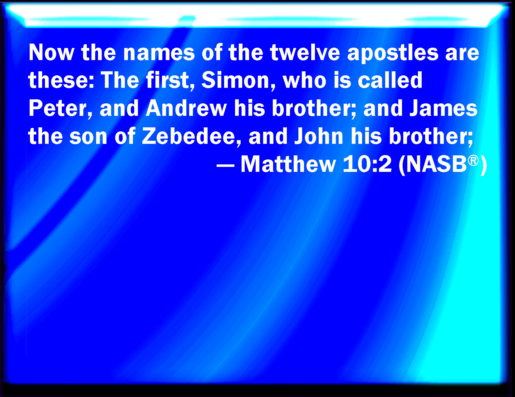 Matthew 10:2 Now the names of the twelve apostles are these; The first, Simon, who is called Peter, and Andrew his brother; James the son of Zebedee, and John his brother;