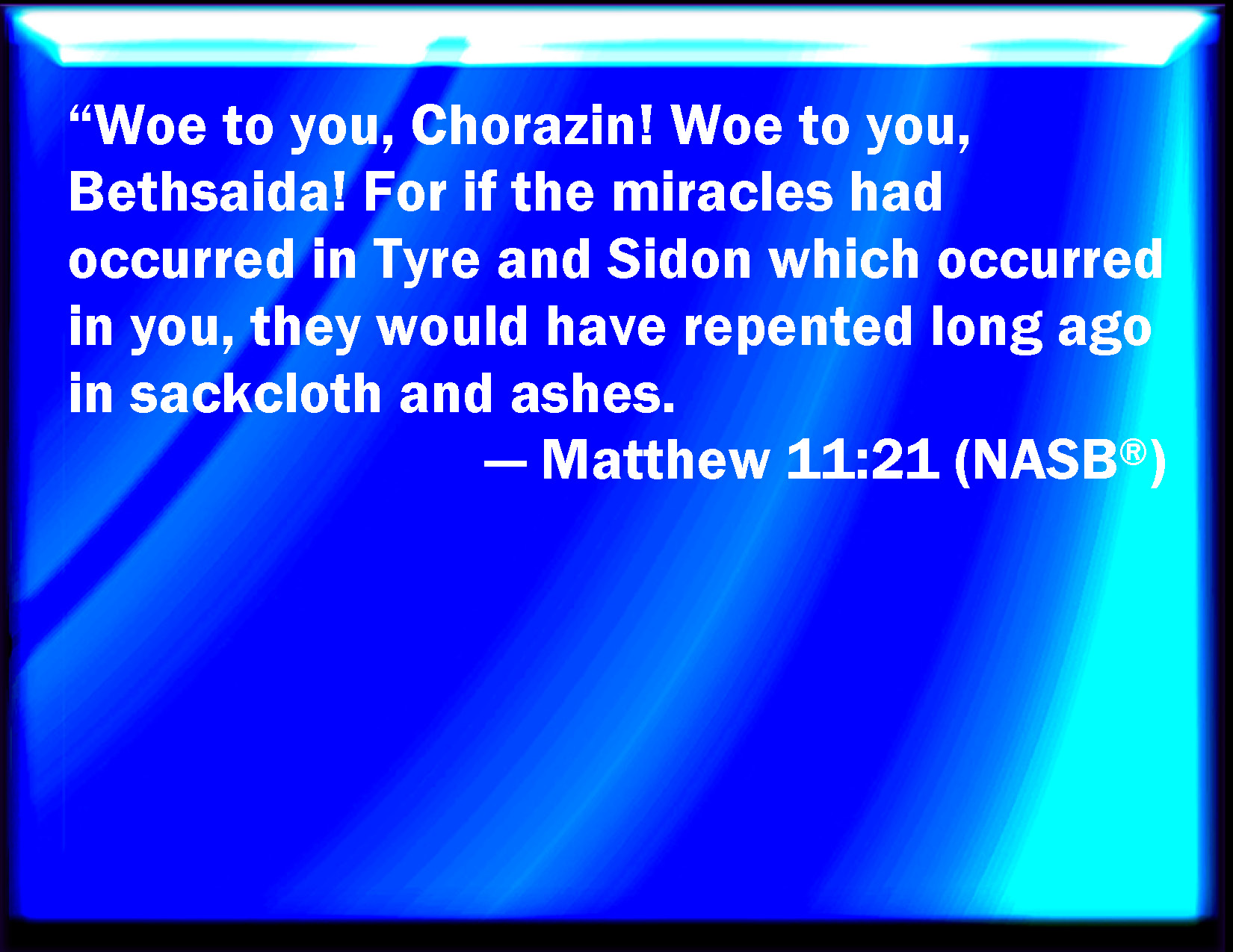 Bible Verse Slide Matthew 11:21 Woe to you, Chorazin! woe to you, Bethsaida! for if the mighty works, which were done in you, had been done in Tyre and Sidon, they would have repented long ago in sackcloth and ashes. KJV: Woe unto thee, Chorazin! woe unto thee, Bethsaida! for if the mighty works, which were done in you, had been done in Tyre and Sidon, they would have repented long ago in sackcloth and ashes. DRB: Woe to thee, Corozain, woe to thee, Bethsaida: for if in Tyre and Sidon had been wrought the miracles that have been wrought in you, they had long ago done penance in sackcloth and ashes. DBT: Woe to thee, Chorazin! woe to thee Bethsaida! for if the works of power which have taken place in you, had taken place in Tyre and Sidon, they had long ago repented in sackcloth and ashes. ERV: Woe unto thee, Chorazin! woe unto thee, Bethsaida! for if the mighty works had been done in Tyre and Sidon which were done in you, they would have repented long ago in sackcloth and ashes. WBT: Woe to thee, Chorazin; woe to thee, Bethsaida: for if the mighty works which have been done in you had been done in Tyre and Sidon, they would have repented long ago in sackcloth and ashes. WEB: "Woe to you, Chorazin! Woe to you, Bethsaida! For if the mighty works had been done in Tyre and Sidon which were done in you, they would have repented long ago in sackcloth and ashes. YLT: 'Woe to thee, Chorazin! woe to thee, Bethsaida! because, if in Tyre and Sidon had been done the mighty works that were done in you, long ago in sackcloth and ashes they had reformed;Links Matthew 11:21 NIV • Matthew 11:21 NLT • Matthew 11:21 ESV • Matthew 11:21 NASB • Matthew 11:21 KJV • Matthew 11:21 Interlinear • Matthew 11:21 Commentaries • Matthew 11:21 Parallel Texts • Matthew 11:21 Bible Apps • Matthew 11:21 Parallel • Bible Hub |