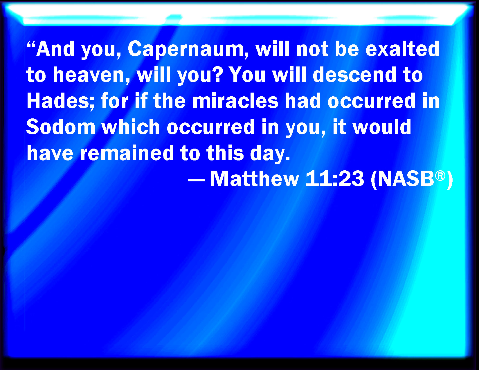 Bible Verse Slide Matthew 11:23 And you, Capernaum, which are exalted to heaven, shall be brought down to hell: for if the mighty works, which have been done in you, had been done in Sodom, it would have remained until this day. KJV: And thou, Capernaum, which art exalted unto heaven, shalt be brought down to hell: for if the mighty works, which have been done in thee, had been done in Sodom, it would have remained until this day. DRB: And thou Capharnaum, shalt thou be exalted up to heaven? thou shalt go down even unto hell. For if in Sodom had been wrought the miracles that have been wrought in thee, perhaps it had remained unto this day. DBT: And thou, Capernaum, who hast been raised up to heaven, shalt be brought down even to hades. For if the works of power which have taken place in thee, had taken place in Sodom, it had remained until this day. ERV: And thou, Capernaum, shalt thou be exalted unto heaven? thou shalt go down unto Hades: for if the mighty works had been done in Sodom which were done in thee, it would have remained until this day. WBT: And thou, Capernaum, which art exalted to heaven, shalt be brought down to hell: for if the mighty works which have been done in thee, had been done in Sodom, it would have remained until this day. WEB: You, Capernaum, who are exalted to heaven, you will go down to Hades. For if the mighty works had been done in Sodom which were done in you, it would have remained until this day. YLT: 'And thou, Capernaum, which unto the heaven wast exalted, unto hades shalt be brought down, because if in Sodom had been done the mighty works that were done in thee, it had remained unto this day;Links Matthew 11:23 NIV • Matthew 11:23 NLT • Matthew 11:23 ESV • Matthew 11:23 NASB • Matthew 11:23 KJV • Matthew 11:23 Interlinear • Matthew 11:23 Commentaries • Matthew 11:23 Parallel Texts • Matthew 11:23 Bible Apps • Matthew 11:23 Parallel • Bible Hub |