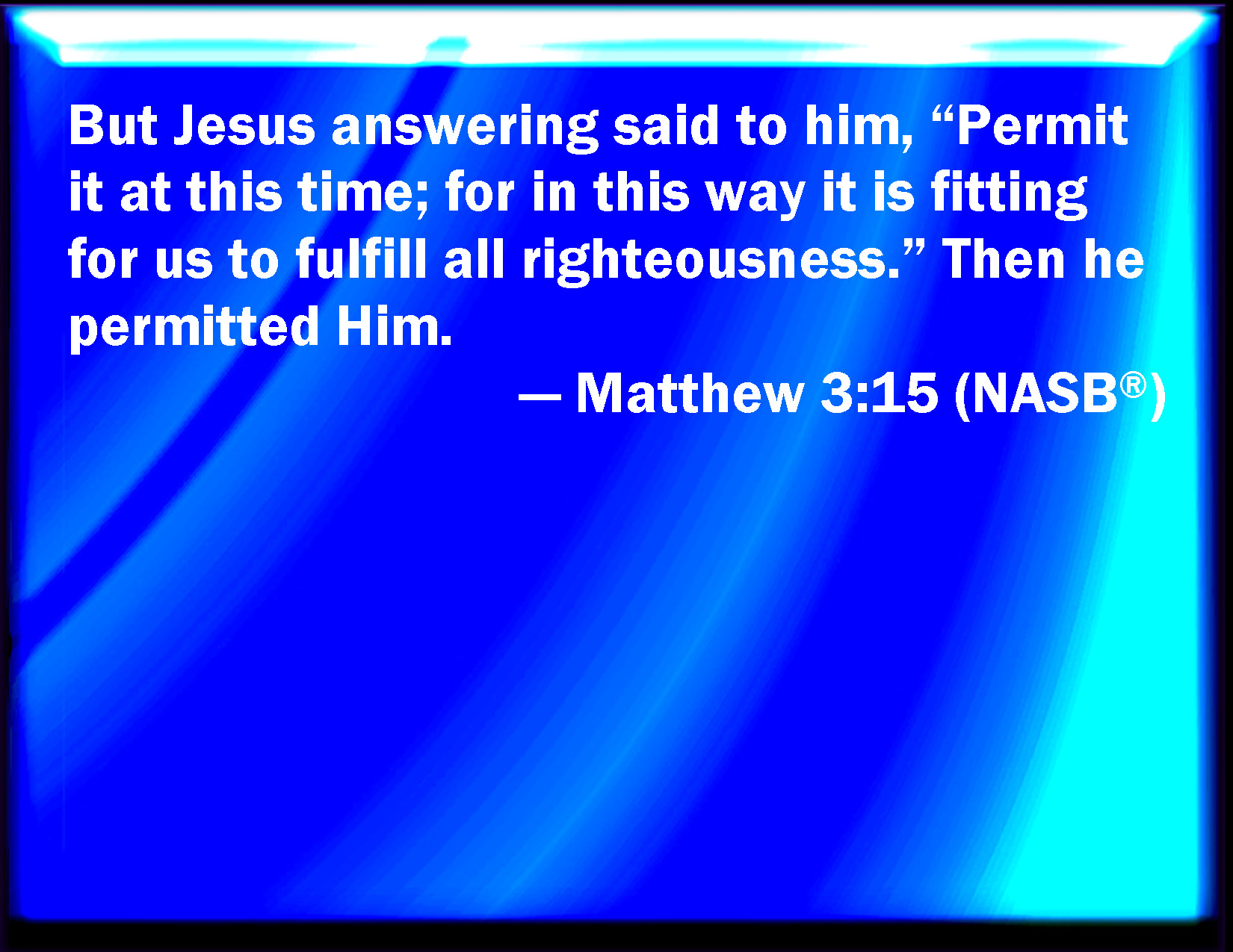 Bible Verse Slide Matthew 3:15 And Jesus answering said to him, Suffer it to be so now: for thus it becomes us to fulfill all righteousness. Then he suffered him. KJV: And Jesus answering said unto him, Suffer it to be so now: for thus it becometh us to fulfil all righteousness. Then he suffered him. DRB: And Jesus answering, said to him: Suffer it to be so now. For so it becometh us to fulfill all justice. Then he suffered him. DBT: But Jesus answering said to him, Suffer it now; for thus it becometh us to fulfil all righteousness. Then he suffers him. ERV: But Jesus answering said unto him, Suffer it now: for thus it becometh us to fulfill all righteousness. Then he suffereth him. WBT: And Jesus answering said to him, Suffer it to be so now: for thus it becometh us to fulfill all righteousness. Then he suffered him. WEB: But Jesus, answering, said to him, "Allow it now, for this is the fitting way for us to fulfill all righteousness." Then he allowed him. YLT: But Jesus answering said to him, 'Suffer now, for thus it is becoming to us to fulfil all righteousness,' then he doth suffer him.Links Matthew 3:15 NIV • Matthew 3:15 NLT • Matthew 3:15 ESV • Matthew 3:15 NASB • Matthew 3:15 KJV • Matthew 3:15 Interlinear • Matthew 3:15 Commentaries • Matthew 3:15 Parallel Texts • Matthew 3:15 Bible Apps • Matthew 3:15 Parallel • Bible Hub |