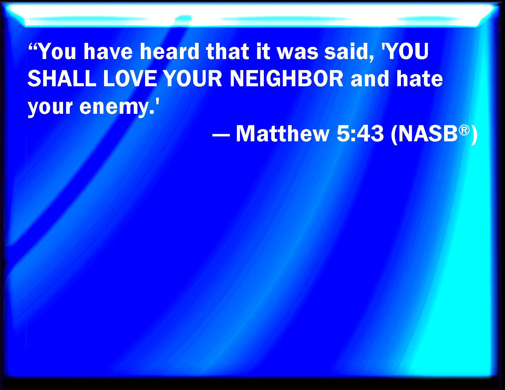 Bible Verse Slide Matthew 5:43 You have heard that it has been said, You shall love your neighbor, and hate your enemy. KJV: Ye have heard that it hath been said, Thou shalt love thy neighbour, and hate thine enemy. DRB: You have heard that it hath been said, Thou shalt love thy neighbor, and hate thy enemy. DBT: Ye have heard that it has been said, Thou shalt love thy neighbour and hate thine enemy. ERV: Ye have heard that it was said, Thou shalt love thy neighbour, and hate thine enemy: WBT: Ye have heard that it hath been said, Thou shalt love thy neighbor, and hate thy enemy: WEB: "You have heard that it was said, 'You shall love your neighbor, and hate your enemy.' YLT: 'Ye heard that it was said: Thou shalt love thy neighbour, and shalt hate thine enemy;Links Matthew 5:43 NIV • Matthew 5:43 NLT • Matthew 5:43 ESV • Matthew 5:43 NASB • Matthew 5:43 KJV • Matthew 5:43 Interlinear • Matthew 5:43 Commentaries • Matthew 5:43 Parallel Texts • Matthew 5:43 Bible Apps • Matthew 5:43 Parallel • Bible Hub |
