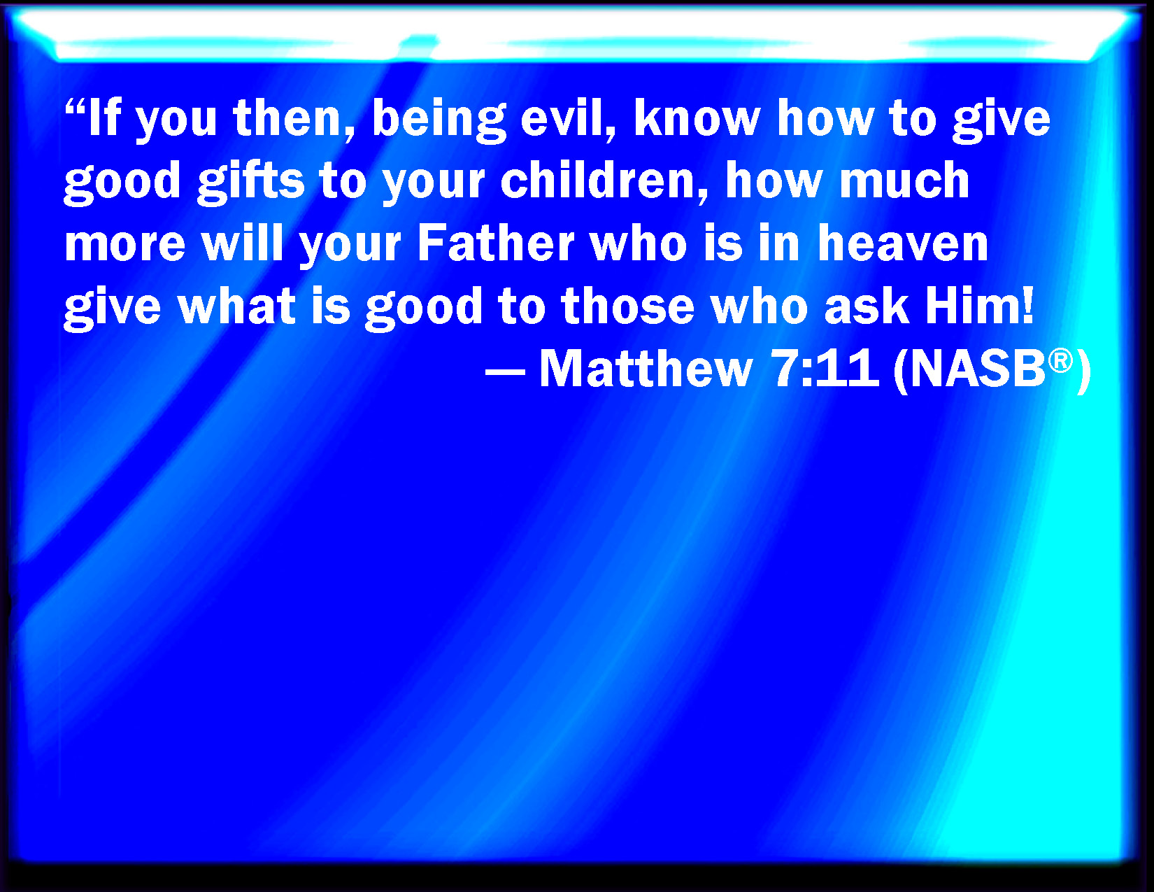 Bible Verse Slide Matthew 7:11 If you then, being evil, know how to give good gifts to your children, how much more shall your Father which is in heaven give good things to them that ask him? KJV: If ye then, being evil, know how to give good gifts unto your children, how much more shall your Father which is in heaven give good things to them that ask him? DRB: If you then being evil, know how to give good gifts to your children: how much more will your Father who is in heaven, give good things to them that ask him? DBT: If therefore ye, being wicked, know how to give good gifts to your children, how much rather shall your Father who is in the heavens give good things to them that ask of him? ERV: If ye then, being evil, know how to give good gifts unto your children, how much more shall your Father which is in heaven give good things to them that ask him? WBT: If ye then being evil know how to give good gifts to your children, how much more shall your Father who is in heaven give good things to them that ask him? WEB: If you then, being evil, know how to give good gifts to your children, how much more will your Father who is in heaven give good things to those who ask him! YLT: if, therefore, ye being evil, have known good gifts to give to your children, how much more shall your Father who is in the heavens give good things to those asking him?Links Matthew 7:11 NIV • Matthew 7:11 NLT • Matthew 7:11 ESV • Matthew 7:11 NASB • Matthew 7:11 KJV • Matthew 7:11 Interlinear • Matthew 7:11 Commentaries • Matthew 7:11 Parallel Texts • Matthew 7:11 Bible Apps • Matthew 7:11 Parallel • Bible Hub |