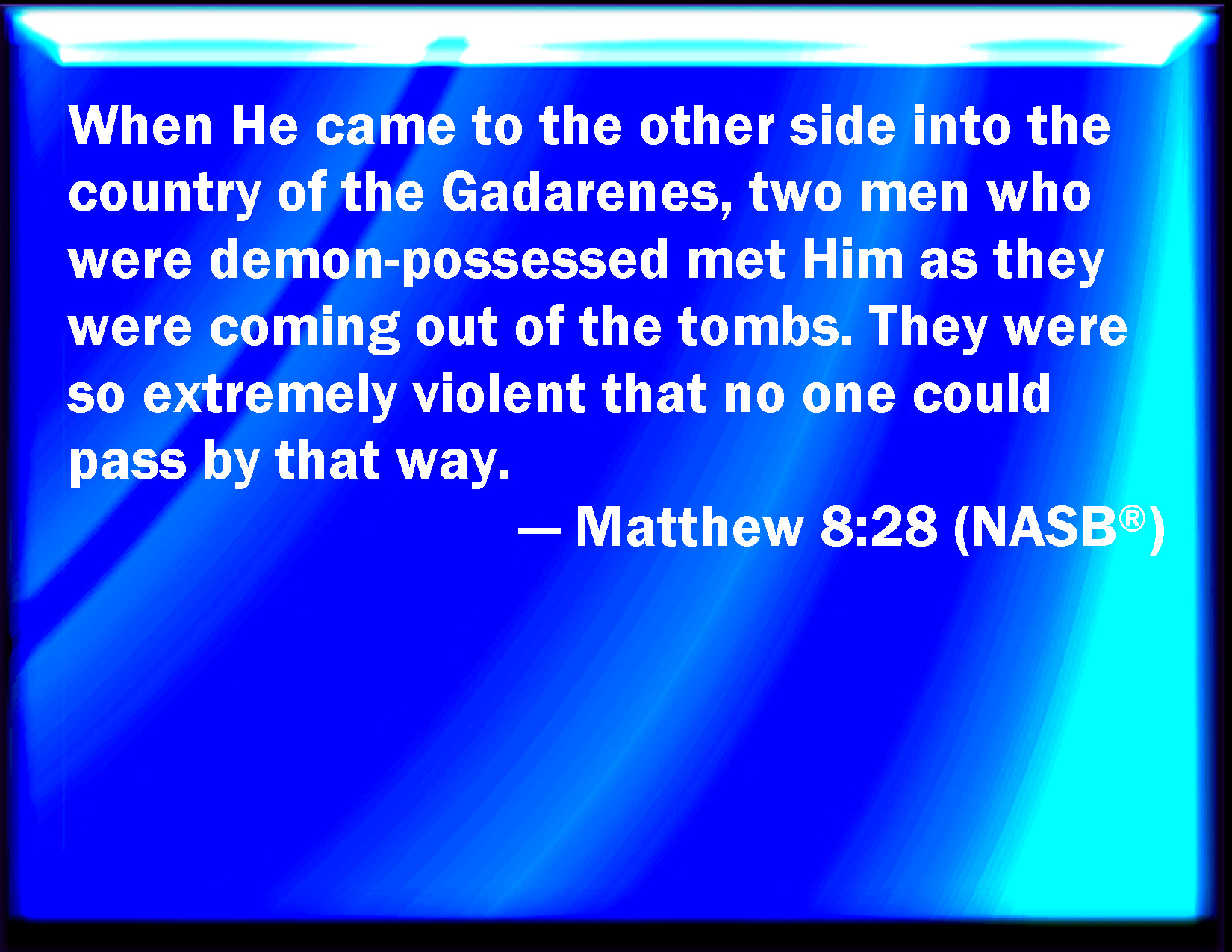 Bible Verse Slide Matthew 8:28 And when he was come to the other side into the country of the Gergesenes, there met him two possessed with devils, coming out of the tombs, exceeding fierce, so that no man might pass by that way. KJV: And when he was come to the other side into the country of the Gergesenes, there met him two possessed with devils, coming out of the tombs, exceeding fierce, so that no man might pass by that way. DRB: And when he was come on the other side of the water, into the country of the Gerasens, there met him two that were possessed with devils, coming out of the sepulchres, exceeding fierce, so that none could pass by that way. DBT: And there met him, when he came to the other side, to the country of the Gergesenes, two possessed by demons, coming out of the tombs, exceeding dangerous, so that no one was able to pass by that way. ERV: And when he was come to the other side into the country of the Gadarenes, there met him two possessed with devils, coming forth out of the tombs, exceeding fierce, so that no man could pass by that way. WBT: And when he had come to the other side, into the country of the Gergesenes, there met him two possessed with demons, coming out of the tombs, exceeding fierce, so that no man might pass by that way. WEB: When he came to the other side, into the country of the Gergesenes, two people possessed by demons met him there, coming out of the tombs, exceedingly fierce, so that nobody could pass that way. YLT: And he having come to the other side, to the region of the Gergesenes, there met him two demoniacs, coming forth out of the tombs, very fierce, so that no one was able to pass over by that way,Links Matthew 8:28 NIV • Matthew 8:28 NLT • Matthew 8:28 ESV • Matthew 8:28 NASB • Matthew 8:28 KJV • Matthew 8:28 Interlinear • Matthew 8:28 Commentaries • Matthew 8:28 Parallel Texts • Matthew 8:28 Bible Apps • Matthew 8:28 Parallel • Bible Hub |