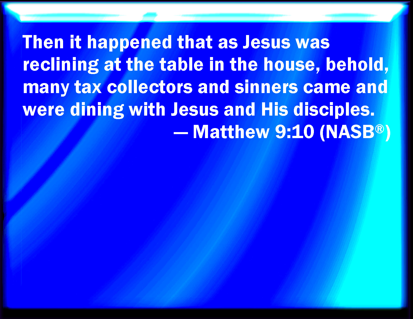 Bible Verse Slide Matthew 9:10 And it came to pass, as Jesus sat at meat in the house, behold, many publicans and sinners came and sat down with him and his disciples. KJV: And it came to pass, as Jesus sat at meat in the house, behold, many publicans and sinners came and sat down with him and his disciples. DRB: And it came to pass as he was sitting at meat in the house, behold many publicans and sinners came, and sat down with Jesus and his disciples. DBT: And it came to pass, as he lay at table in the house, that behold, many tax-gatherers and sinners came and lay at table with Jesus and his disciples. ERV: And it came to pass, as he sat at meat in the house, behold, many publicans and sinners came and sat down with Jesus and his disciples. WBT: And it came to pass, as Jesus sat at table in the house, behold, many publicans and sinners came and sat down with him and his disciples. WEB: It happened as he sat in the house, behold, many tax collectors and sinners came and sat down with Jesus and his disciples. YLT: And it came to pass, he reclining (at meat) in the house, that lo, many tax-gatherers and sinners having come, were lying (at meat) with Jesus and his disciples,Links Matthew 9:10 NIV • Matthew 9:10 NLT • Matthew 9:10 ESV • Matthew 9:10 NASB • Matthew 9:10 KJV • Matthew 9:10 Interlinear • Matthew 9:10 Commentaries • Matthew 9:10 Parallel Texts • Matthew 9:10 Bible Apps • Matthew 9:10 Parallel • Bible Hub |