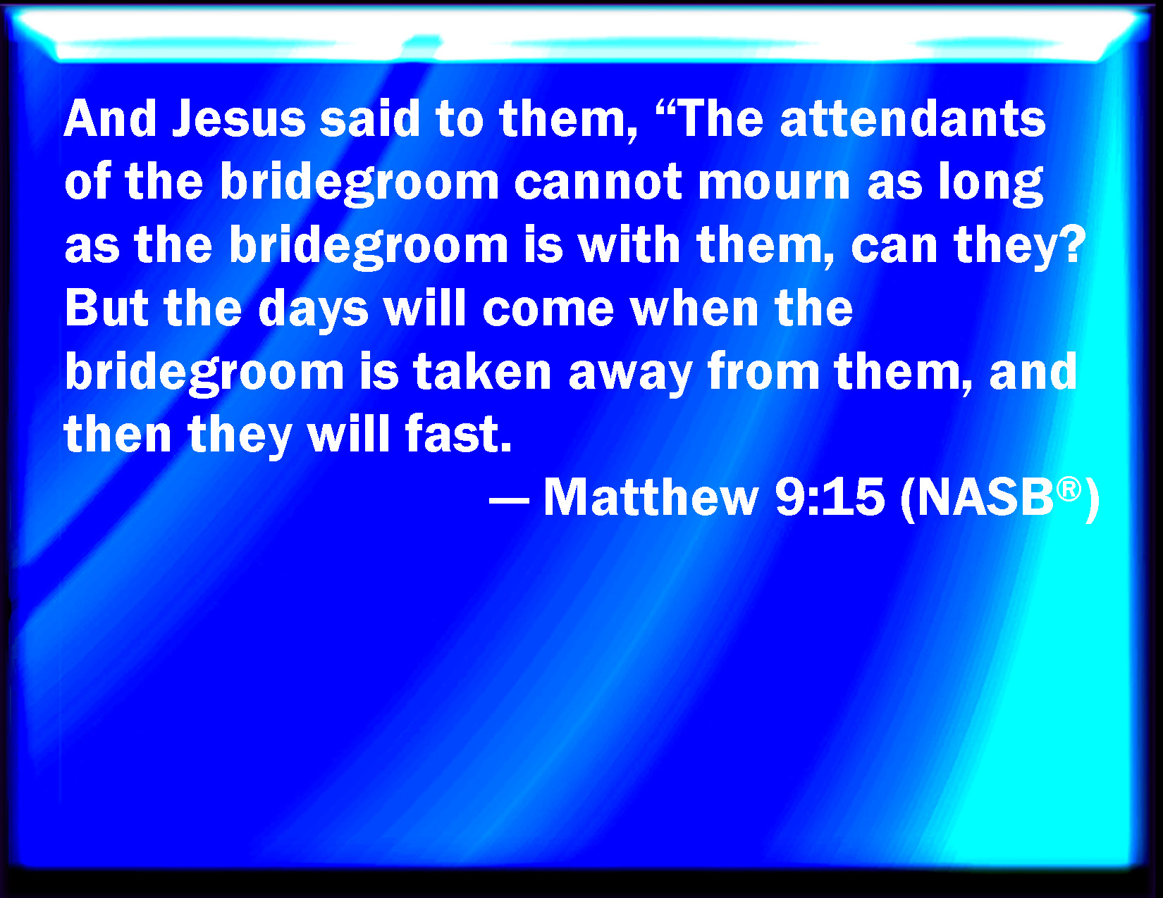 Bible Verse Slide Matthew 9:15 And Jesus said to them, Can the children of the bridal chamber mourn, as long as the bridegroom is with them? but the days will come, when the bridegroom shall be taken from them, and then shall they fast. KJV: And Jesus said unto them, Can the children of the bridechamber mourn, as long as the bridegroom is with them? but the days will come, when the bridegroom shall be taken from them, and then shall they fast. DRB: And Jesus said to them: Can the children of the bridegroom mourn, as long as the bridegroom is with them? But the days will come, when the bridegroom shall be taken away from them, and then they shall fast. DBT: And Jesus said to them, Can the sons of the bridechamber mourn so long as the bridegroom is with them? But days will come when the bridegroom will have been taken away from them, and then they will fast. ERV: And Jesus said unto them, Can the sons of the bride-chamber mourn, as long as the bridegroom is with them? but the days will come, when the bridegroom shall be taken away from them, and then will they fast. WBT: And Jesus said to them, Can the children of the bride-chamber mourn, as long as the bridegroom is with them? but the days will come, when the bridegroom shall be taken from them, and then they will fast. WEB: Jesus said to them, "Can the friends of the bridegroom mourn, as long as the bridegroom is with them? But the days will come when the bridegroom will be taken away from them, and then they will fast. YLT: And Jesus said to them, 'Can the sons of the bride-chamber mourn, so long as the bridegroom is with them? but days shall come when the bridegroom may be taken from them, and then they shall fast.Links Matthew 9:15 NIV • Matthew 9:15 NLT • Matthew 9:15 ESV • Matthew 9:15 NASB • Matthew 9:15 KJV • Matthew 9:15 Interlinear • Matthew 9:15 Commentaries • Matthew 9:15 Parallel Texts • Matthew 9:15 Bible Apps • Matthew 9:15 Parallel • Bible Hub |