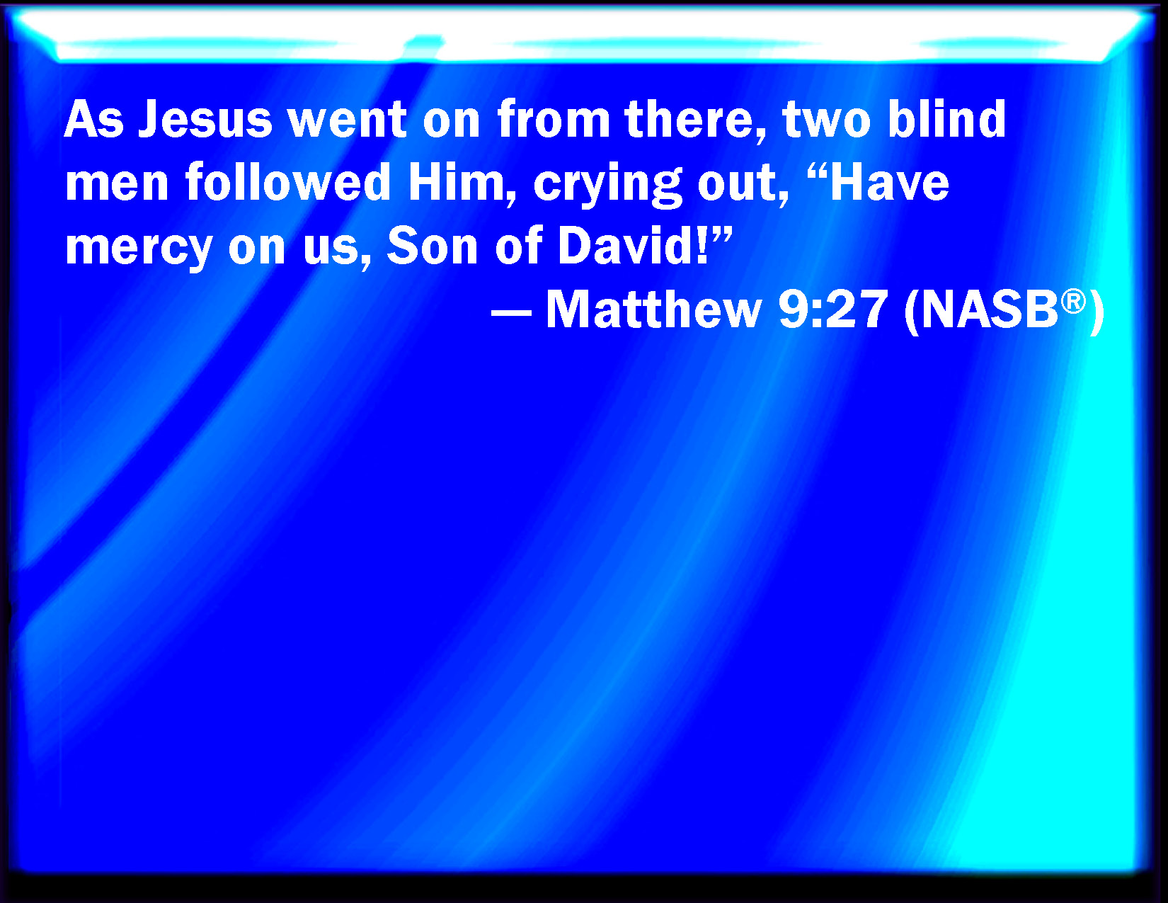 Bible Verse Slide Matthew 9:27 And when Jesus departed there, two blind men followed him, crying, and saying, You son of David, have mercy on us. KJV: And when Jesus departed thence, two blind men followed him, crying, and saying, Thou Son of David, have mercy on us. DRB: And as Jesus passed from thence, there followed him two blind men crying out and saying, Have mercy on us, O Son of David. DBT: And as Jesus passed on thence, two blind men followed him, crying and saying, Have mercy on us, Son of David. ERV: And as Jesus passed by from thence, two blind men followed him, crying out, and saying, Have mercy on us, thou son of David. WBT: And when Jesus departed thence, two blind men followed him, crying, and saying, Thou son of David, have mercy on us. WEB: As Jesus passed by from there, two blind men followed him, calling out and saying, "Have mercy on us, son of David!" YLT: And Jesus passing on thence, two blind men followed him, calling and saying, 'Deal kindly with us, Son of David.'Links Matthew 9:27 NIV • Matthew 9:27 NLT • Matthew 9:27 ESV • Matthew 9:27 NASB • Matthew 9:27 KJV • Matthew 9:27 Interlinear • Matthew 9:27 Commentaries • Matthew 9:27 Parallel Texts • Matthew 9:27 Bible Apps • Matthew 9:27 Parallel • Bible Hub |