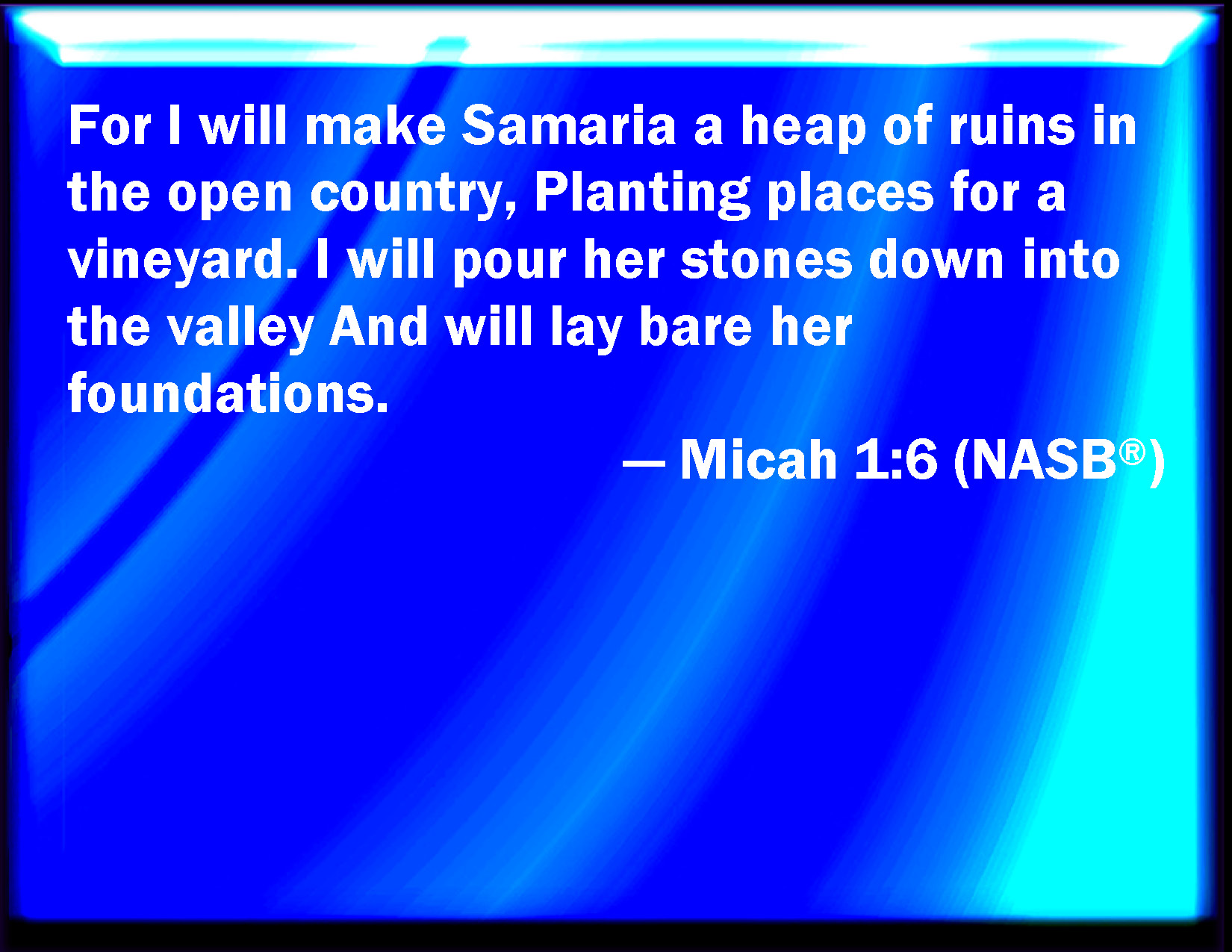 Bible Verse Slide Micah 1:6 Therefore I will make Samaria as an heap of the field, and as plantings of a vineyard: and I will pour down the stones thereof into the valley, and I will discover the foundations thereof. KJV: Therefore I will make Samaria as an heap of the field, and as plantings of a vineyard: and I will pour down the stones thereof into the valley, and I will discover the foundations thereof. DRB: And I will make Samaria as a heap of stones in the field when a vineyard is planted: and I will bring down the stones thereof into the valley, and will lay her foundations bare. DBT: Therefore will I make Samaria as a heap of the field, as plantings of a vineyard; and I will pour down the stones thereof into the valley, and I will lay bare the foundations thereof. ERV: Therefore I will make Samaria as an heap of the field, and as the plantings of a vineyard: and I will pour down the stones thereof into the valley, and I will discover the foundations thereof. WBT: Therefore I will make Samaria as a heap of the field, and as plantings of a vineyard: and I will pour down her stones into the valley, and I will lay bare her foundations. WEB: Therefore I will make Samaria like a rubble heap of the field, like places for planting vineyards; and I will pour down its stones into the valley, and I will uncover its foundations. YLT: And I have set Samaria for a heap of the field, For plantations of a vineyard, And poured out into a valley her stones, And her foundations I uncover.Links Micah 1:6 NIV • Micah 1:6 NLT • Micah 1:6 ESV • Micah 1:6 NASB • Micah 1:6 KJV • Micah 1:6 Interlinear • Micah 1:6 Commentaries • Micah 1:6 Parallel Texts • Micah 1:6 Bible Apps • Micah 1:6 Parallel • Bible Hub |