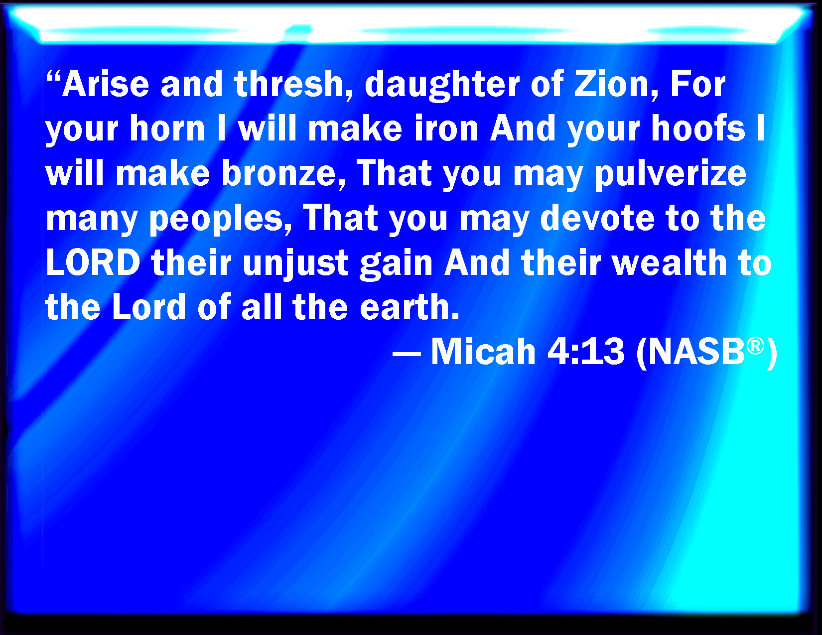 Bible Verse Slide Micah 4:13 Arise and thresh, O daughter of Zion: for I will make your horn iron, and I will make your hoofs brass: and you shall beat in pieces many people: and I will consecrate their gain to the LORD, and their substance to the Lord of the whole earth. KJV: Arise and thresh, O daughter of Zion: for I will make thine horn iron, and I will make thy hoofs brass: and thou shalt beat in pieces many people: and I will consecrate their gain unto the LORD, and their substance unto the Lord of the whole earth. DRB: Arise, and tread, O daughter of Sion: for I will make thy horn iron, and thy hoofs I will make brass: and thou shalt beat in pieces many peoples, and shalt immolate the spoils of them to the Lord, and their strength to the Lord of the whole earth. DBT: Arise and thresh, daughter of Zion, for I will make thy horn iron, and I will make thy hoofs brass; and thou shalt beat in pieces many peoples; and I will devote their gain to Jehovah, and their substance to the Lord of the whole earth. ERV: Arise and thresh, O daughter of Zion: for I will make thine horn iron, and I will make thy hoofs brass: and thou shalt beat in pieces many peoples: and thou shalt devote their gain unto the LORD, and their substance unto the Lord of the whole earth. WBT: Arise and thresh, O daughter of Zion: for I will make thy horn iron, and I will make thy hoofs brass: and thou shalt beat in pieces many people: and I will consecrate their gain to JEHOVAH, and their substance to the Lord of the whole earth. WEB: Arise and thresh, daughter of Zion; for I will make your horn iron, and I will make your hoofs brass; and you will beat in pieces many peoples: and I will devote their gain to Yahweh, and their substance to the Lord of the whole earth. YLT: Arise, and thresh, O daughter of Zion, For thy horn I make iron, And thy hoofs I make brass, And thou hast beaten small many peoples, And I have devoted to Jehovah their gain, And their wealth to the Lord of the whole earth!Links Micah 4:13 NIV • Micah 4:13 NLT • Micah 4:13 ESV • Micah 4:13 NASB • Micah 4:13 KJV • Micah 4:13 Interlinear • Micah 4:13 Commentaries • Micah 4:13 Parallel Texts • Micah 4:13 Bible Apps • Micah 4:13 Parallel • Bible Hub |